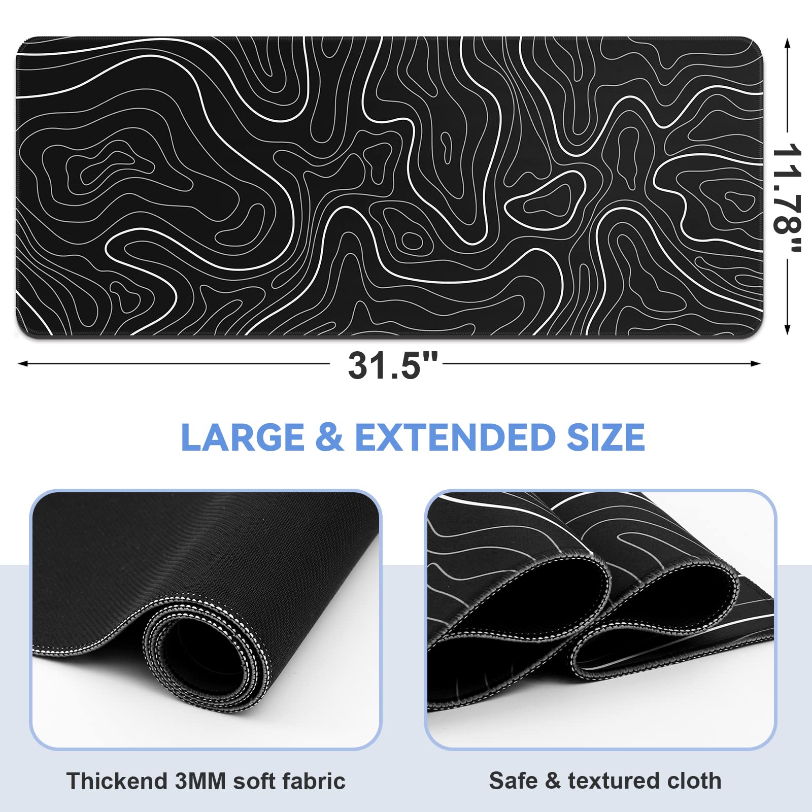 DIGSOM Mouse Pad Gaming Mousepad 31.5 x 11.8in Large Mouse Pad for Keyboard and Mouse with Anti-Slip Rubber Base, Keyboard Pad XL Mouse Mat for Home and Office(Black with White Topographic Line)