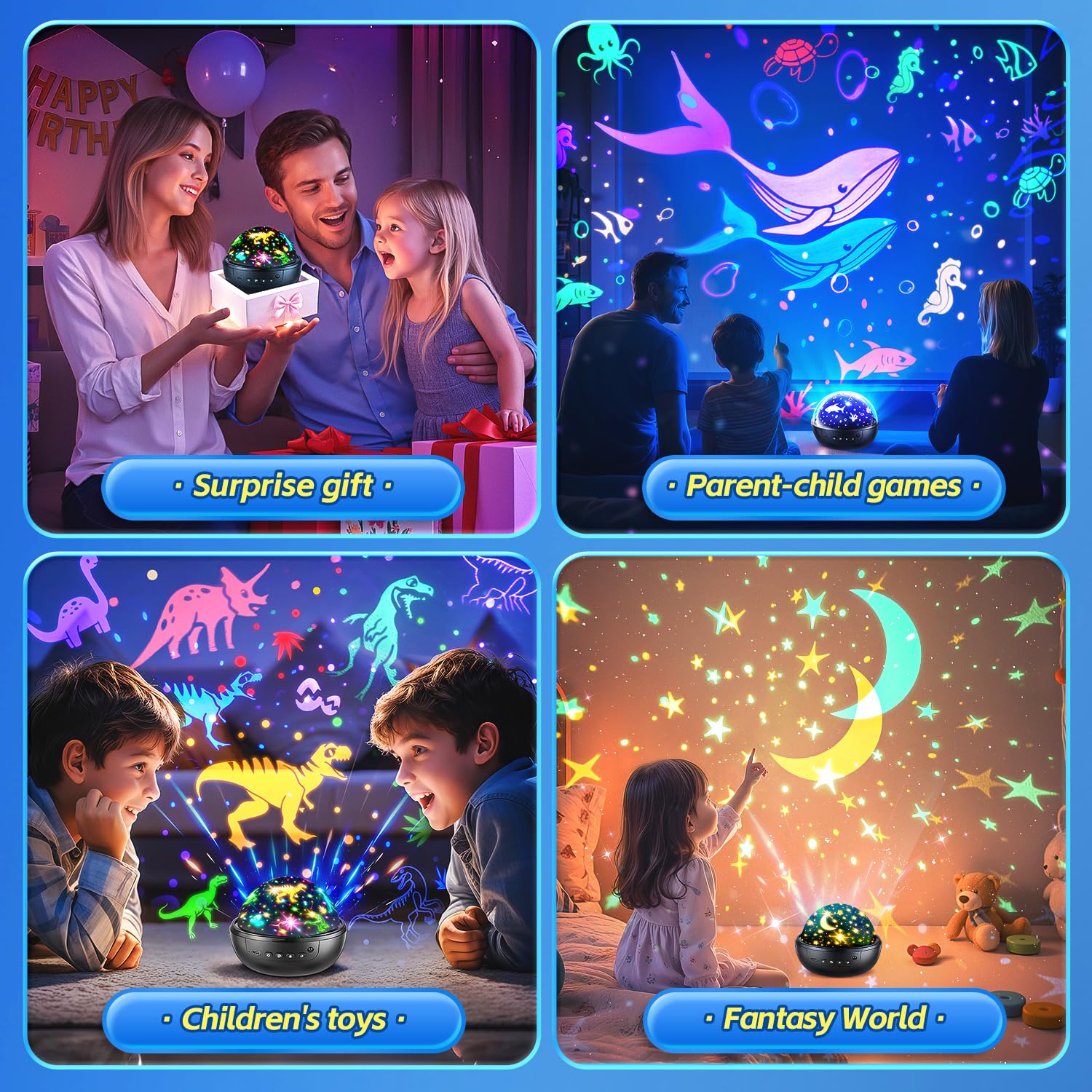 • 🐾【3 FILMS+93 EFFECTS KIDS PROJECTOR NIGHT LIGHT FOR KIDS】The kids night light projector for kids room has 3 FILMS+93 EFFECTS. The kids projector night light for kids has 3 films (DINOSAUR+STARMOON+OCEAN),which can take kid to the world of dinosaur toys,fly to the moon and dance with marine life! How magical the dinosaur toys for kids 5-7,dinosaur toys for kids 3-5,boys toys is! Our projector night light for kids projector night light for kids has 5 light beads (RED+BLUE+GREEN+YELLOW+PURPLE). These 5 basic colors make up the fascinating 31 effects. Kid will love the dinosaur toys for kids 5-7,boys toys,dinosaur night light projector for kids room. Take the dinosaur toys for kids 5-7 home!