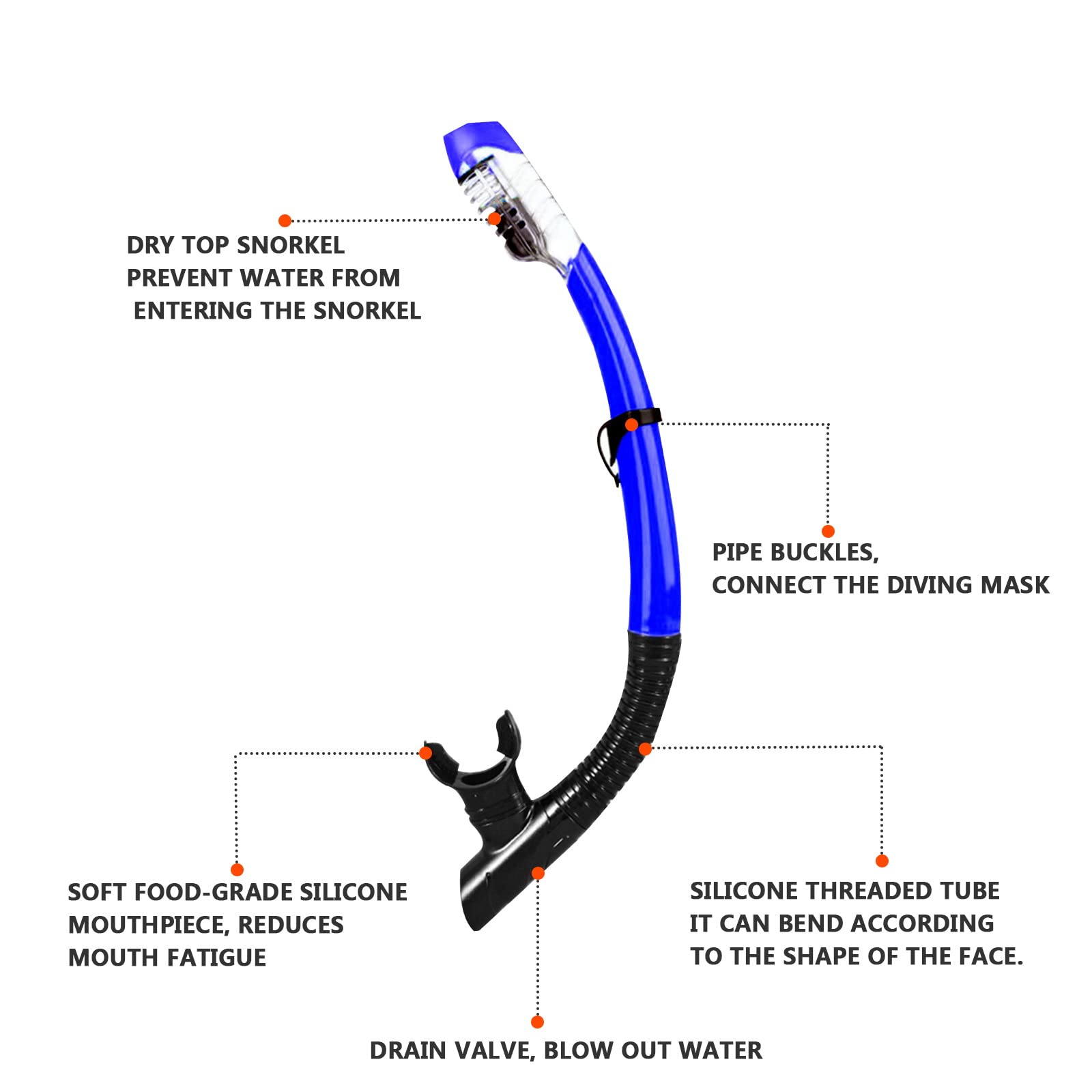 • ●Safe snorkel :The new dry vent pipe uses an automatic closing valve at the opening to prevent water from entering. When the snorkel enters the water, the opening at the top of the snorkel automatically closes and reopens when the snorkel reaches the water surface. Even if the waves hit overhead, the splash guard prevents water from entering the snorkel. Unlike floating ball valves that are easily stuck by small sand particles or other objects, our new valve will not be stuck