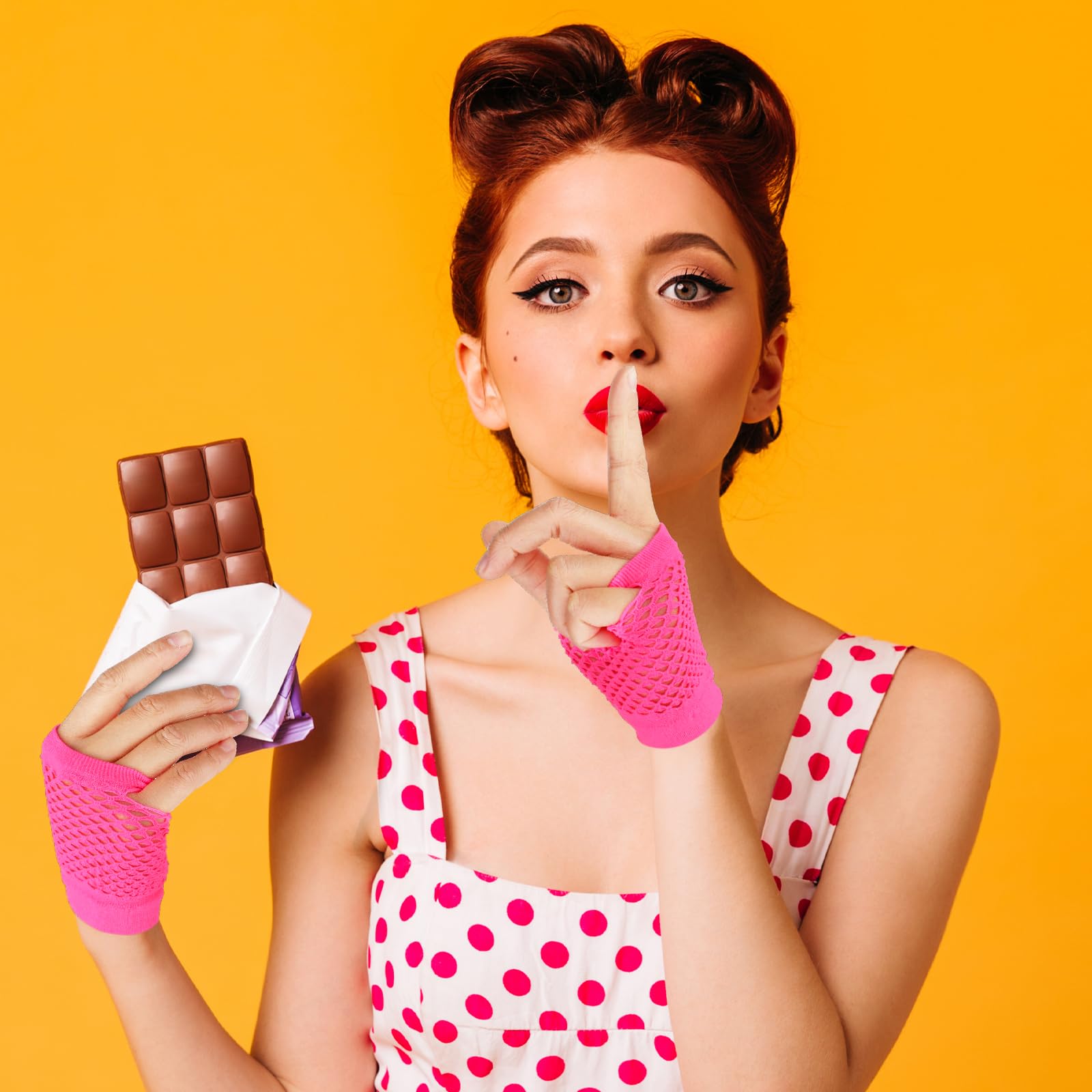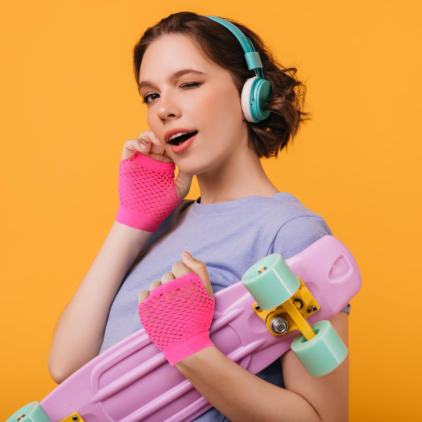 DIVINA VITAE 2 Pairs Pink Fingerless Fishnet Gloves Women 80s Short Stretch Mesh Gloves Retro Nylon Fish Net Fingerless Gloves for 80's Theme Party Halloween Cosplay Women Costume Accessories