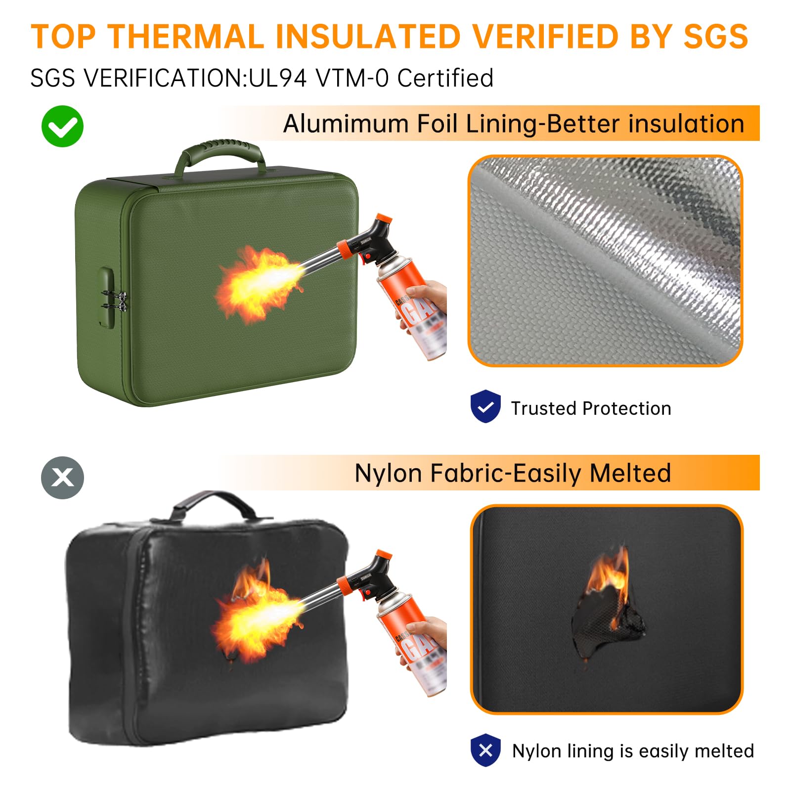 • 5200°F Fireproof & Water-resistant safe: The Upgraded important document organizer is made of thickened silicone coated fireproof cotton material and aluminum foil which withstand the temperature up to 5200℉(double safe protection). Aluminum foil lining isn’t easily melt under high temperature after several tests. It has been passed by SGS TEST(UL94 VTM-0 Certified).The bag is fireproof&Water-resistant, which can effectively protect your important documents in a fire, flood, and wet weather