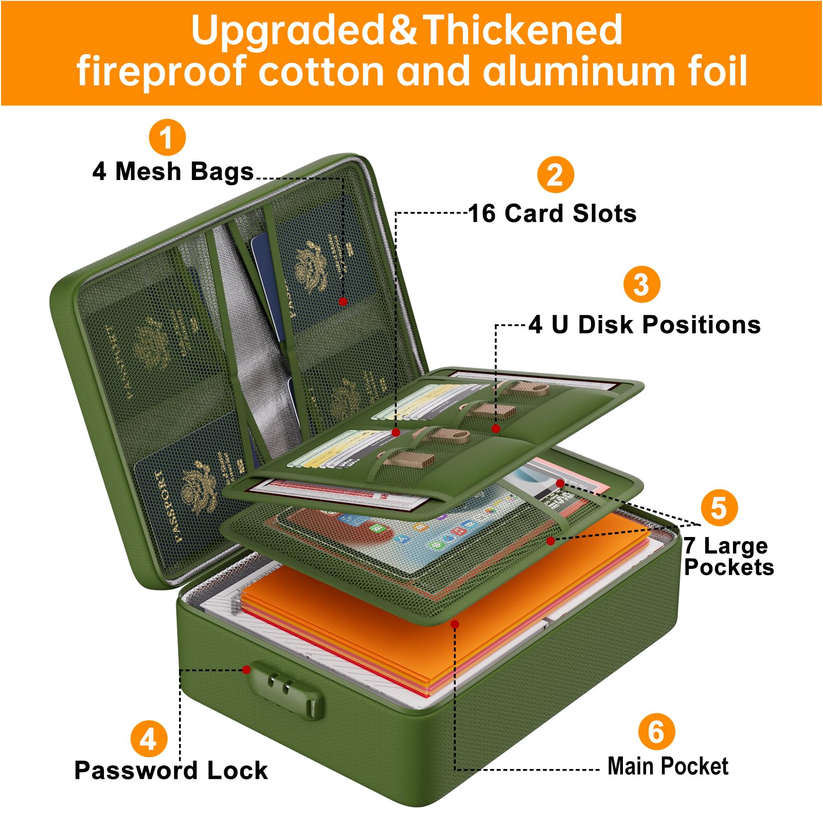 • Soft Box: Large-capacity(15'x11'x4.1'),Compared with other bags,our fireproof file organizer adopts a multi-layer design that can meet all your storage needs. These include 8 passport mesh bags,16 card slots, 4 U Disk pockets, 7 folder layers and one main pocket with a large space. It can store your important documents,files,money,passport,U Disk,cards,laptop,certificates in a safe and orderly way.Great way to organize your files easy for you to find whatever files you looking for quickly