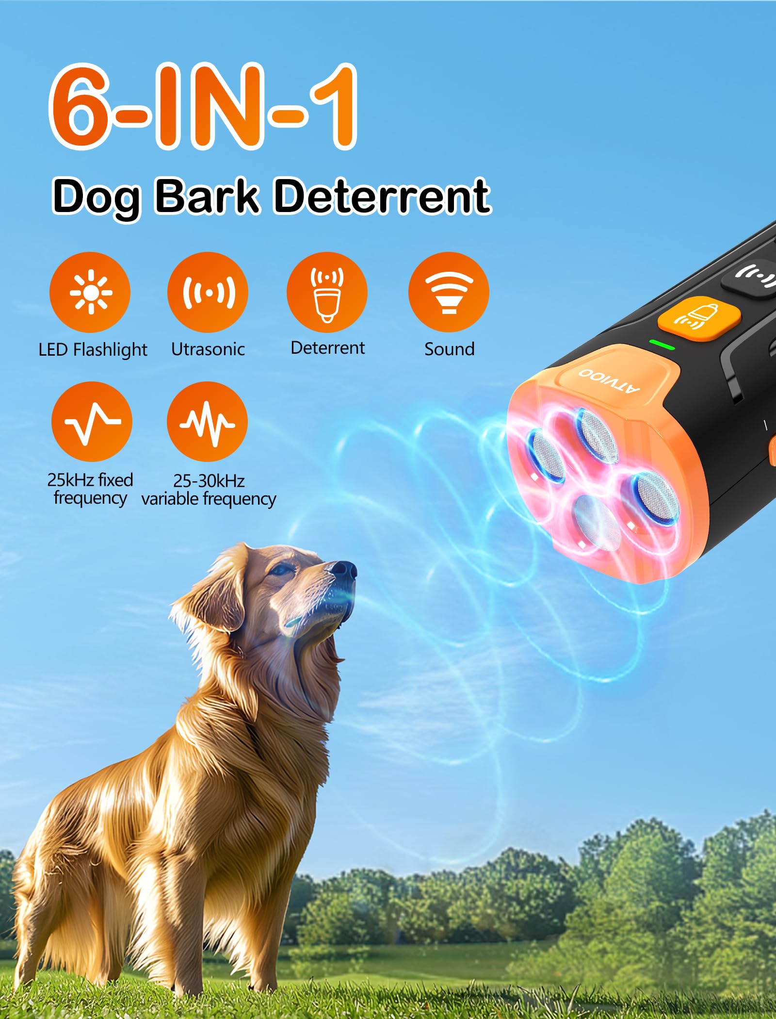 • 6-IN-1 ANTI-BARKING DEVICE - ATVIOO Dog Stop Barking Device integrates training and barking control functions. Using 3 functions (Deterrent Flash, Sound, Ultrasonic) and 2 ultrasonic frequencies, the LED flashlight captures the dog's attention, preventing excessive barking and quickly and painlessly correcting or training the dog's behavior