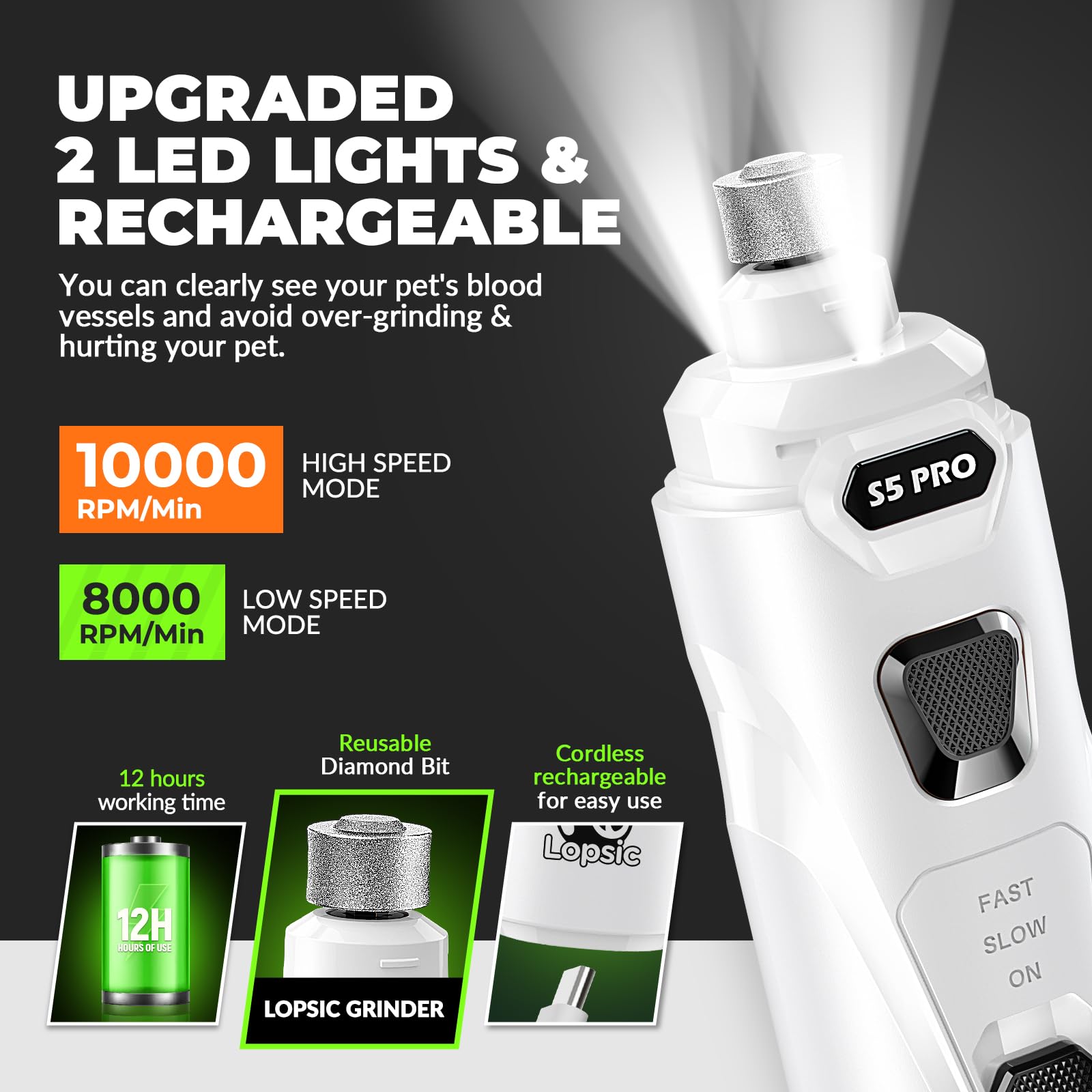 • 【Improved Precision: 2 LED Lights & Adjustable Speeds】: LOPSIC dog nail grinder for dogs features 2 LED lights that offer clear visibility of the quick, ensuring precise and safe nail trimming for your pets. The adjustable speeds(8,000 RPM to 10,000 RPM) of dog nail trimmers can adapt to small, medium and large pets nail trimming needs. When using the dog nail trimmers at the proper speed, pet nails of different hardness can be efficiently ground