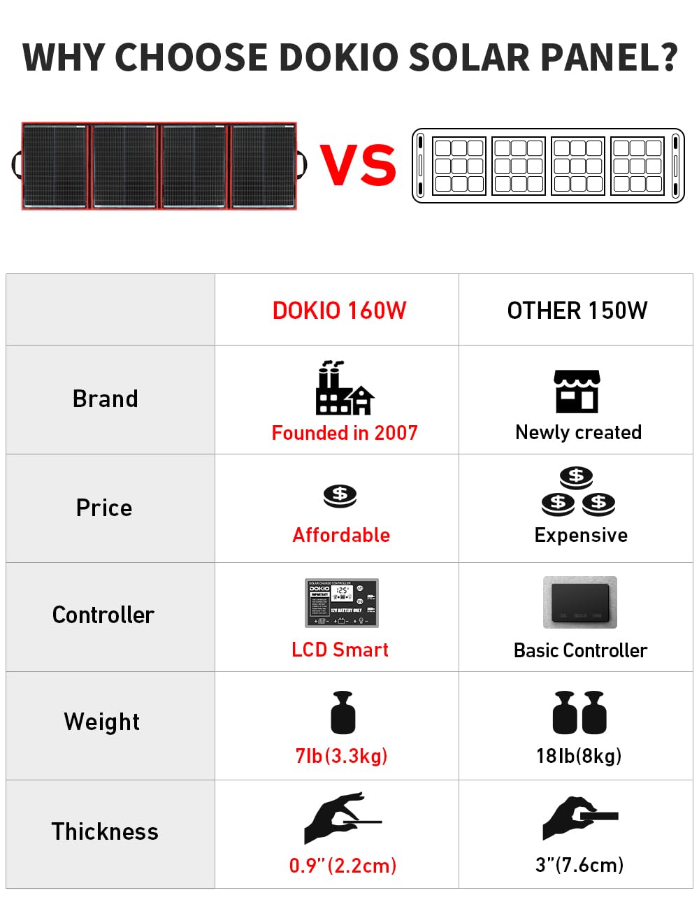 DOKIO 150W Portable Foldable Solar Panel Kit, Compact 21x19in Design 7lb with Standalone Controller and USB, Monocrystalline Charger for 12V Batteries, Power Stations, RV Camping Emergency Use