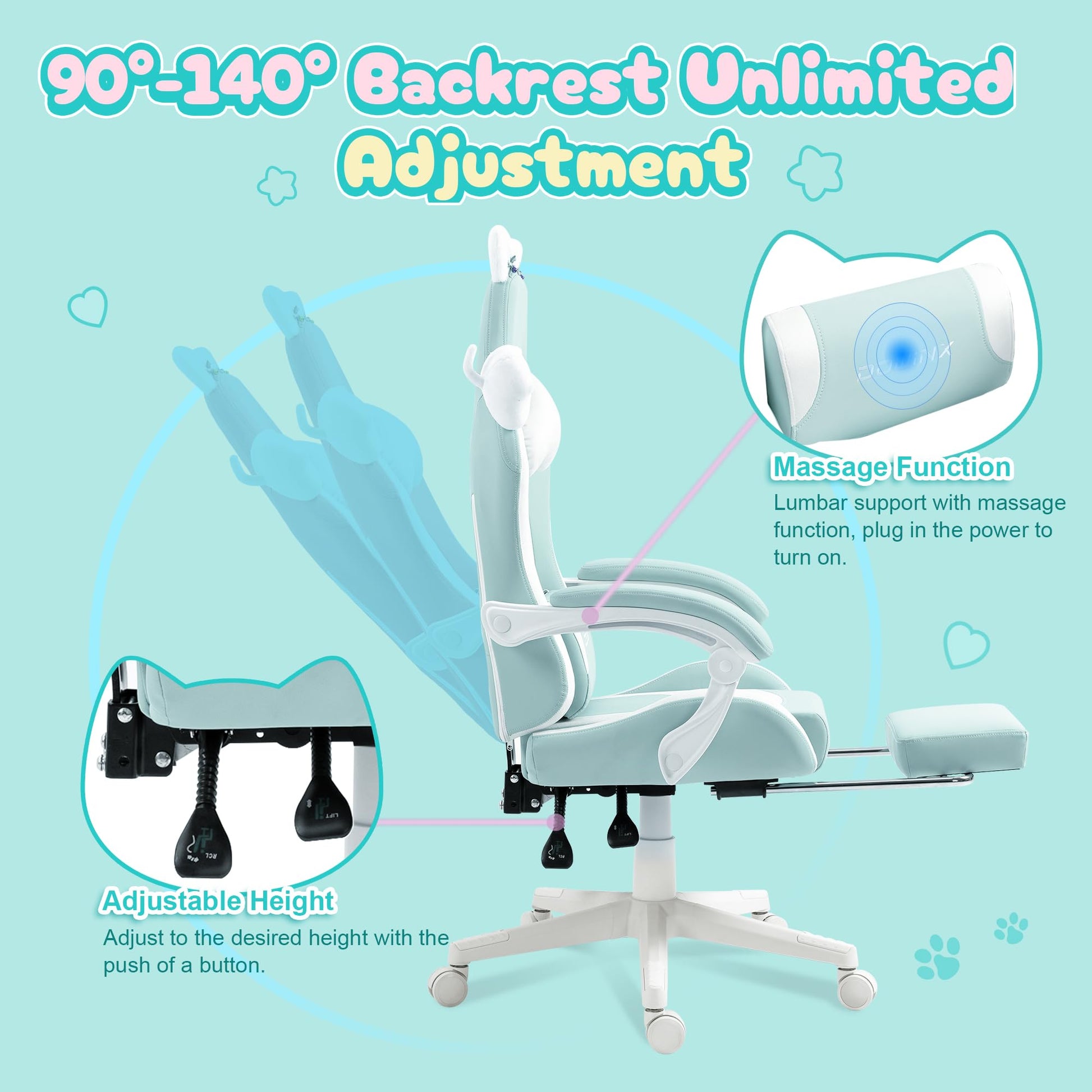 Dowinx Gaming Chair Cute with Cat Ears and Massage Lumbar Support, Ergonomic Computer Chair for Girl with Footrest and Headrest, Comfortable Reclining Game Chair 290lbs for Adult, Teen, Blue Green