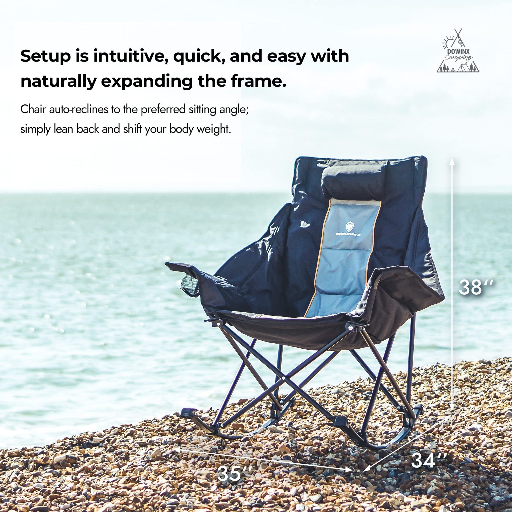 Dowinx Oversized Rocking Camping Chair, Fully Padded Patio Chair with Side Pocket and Carry Bag, High Back Portable Lawn Recliner with Headrest, Support 300 lbs, Grey