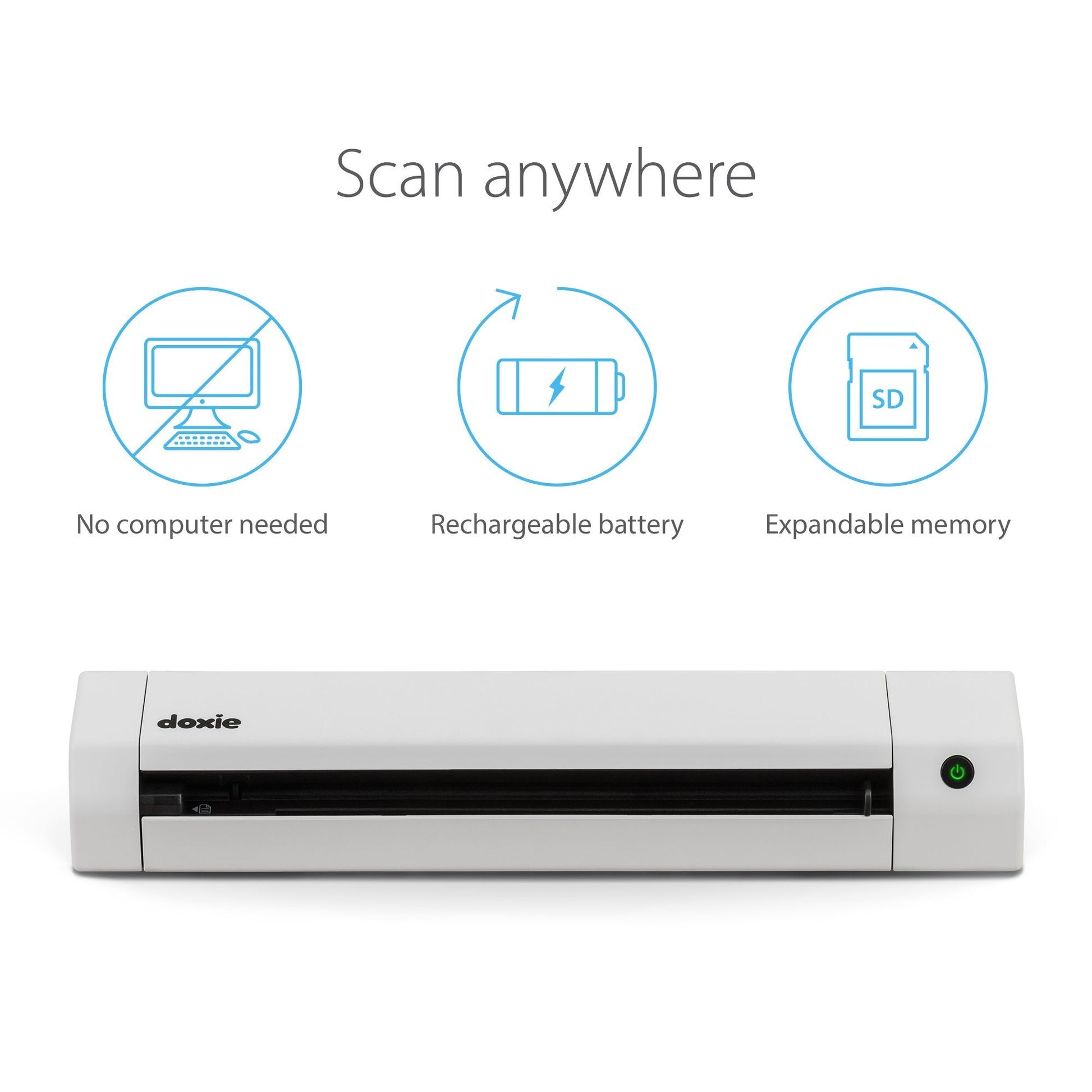• 【Tiny + Battery Powered】Doxie is tiny – the size of a rolled up magazine – and portable with a rechargeable battery and included memory. Scan up to 400 pages per charge, store up to 8,000 pages before needing to sync.