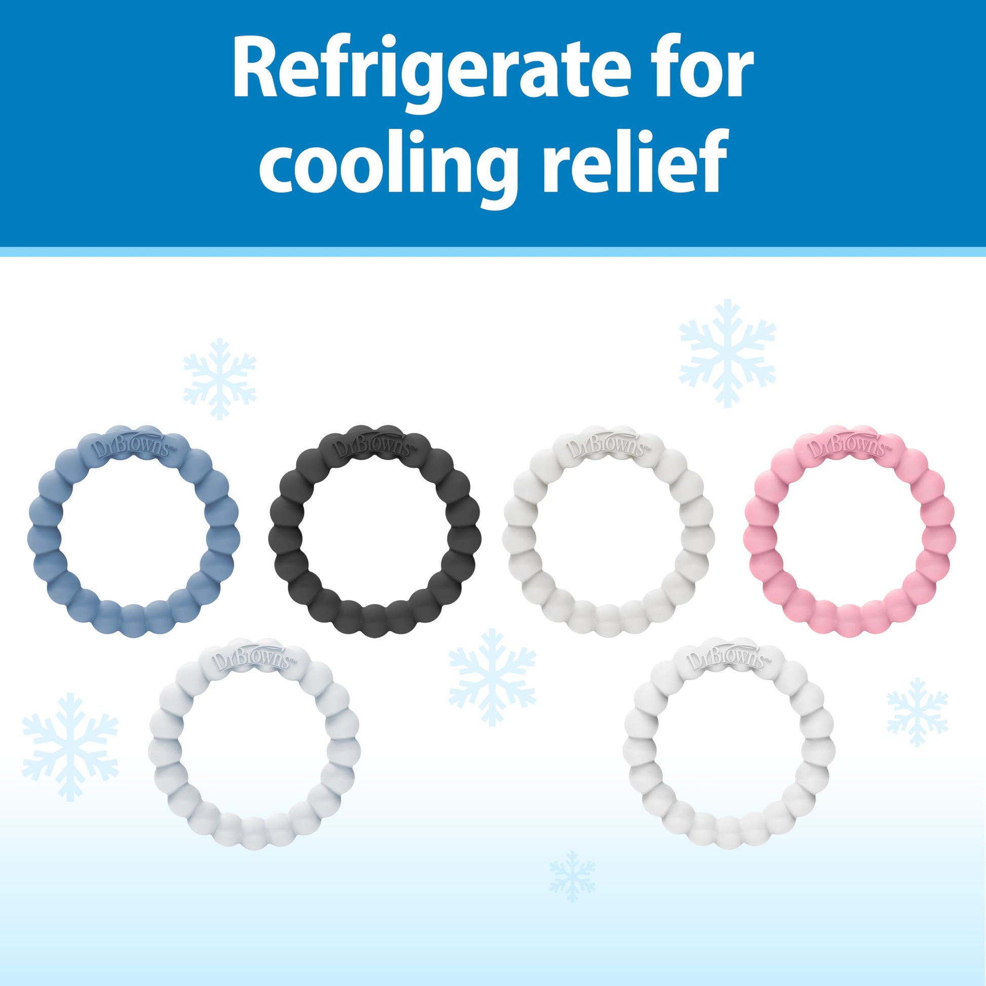 Details: Help soothe baby's sore gums with Dr. Brown's Flexees Beaded Teether Rings, made of soft and durable 100% silicone. The lightweight silicone in a beaded ring design is easy for little fingers to grip and allows baby to self-soothe. The bumpy beaded texture soothes sore spots on baby's teething gums and emerging teeth as baby chews. Use as a cold teether by placing the teething rings in the refrigerator to provide cooling relief on extra sore days. This essential baby teething toy is available in black, white, gray, pink, and blue. Dishwasher (top rack) and sterilizer safe. BPA free. 3m+. Sold in packs of 3.