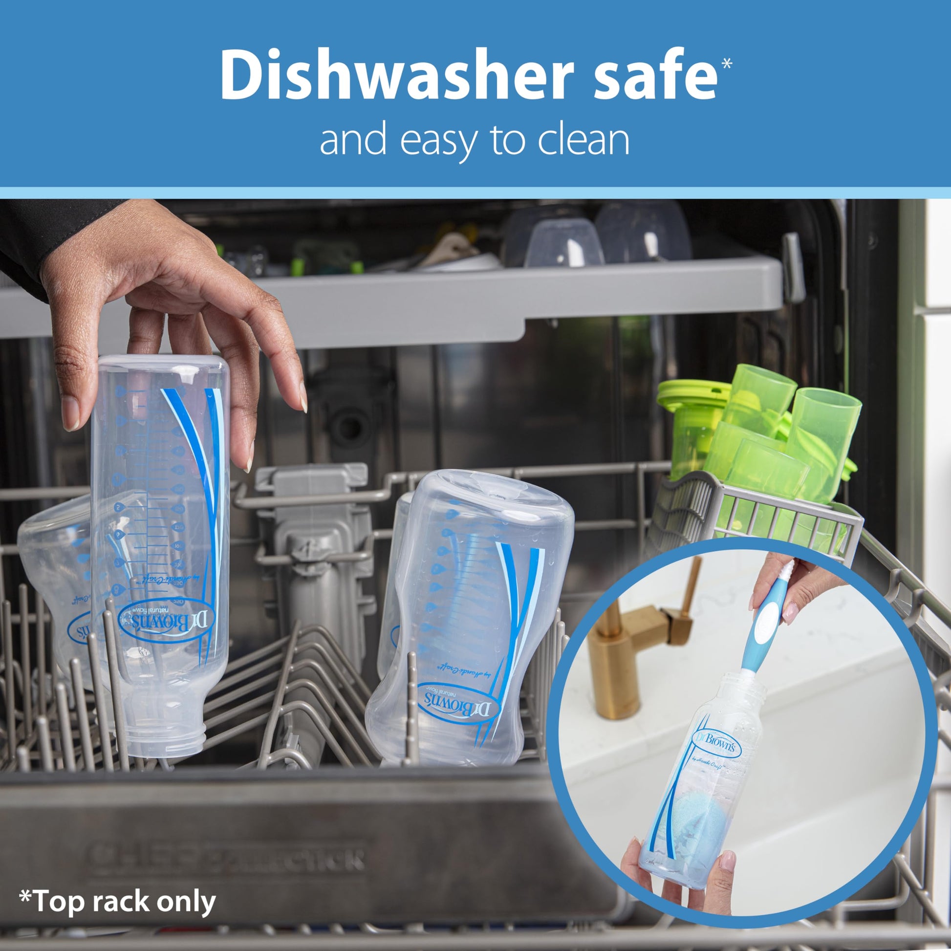 DISHWASHER SAFE. Safe for use in dishwasher (top rack only), electric and microwave sterilizers or boiling water. BPA Free.