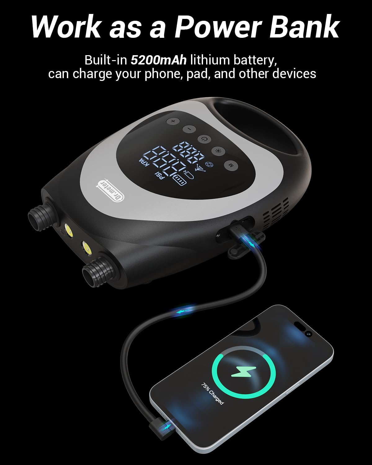 • 5200mAh Rechargeable Power: With a powerful 5200mAh lithium battery, enjoy up to 40 minutes of continuous inflation. Not only does it pump up SUP boards and inflatable boats, but it also doubles as a portable charger for your phone, tablet and more.