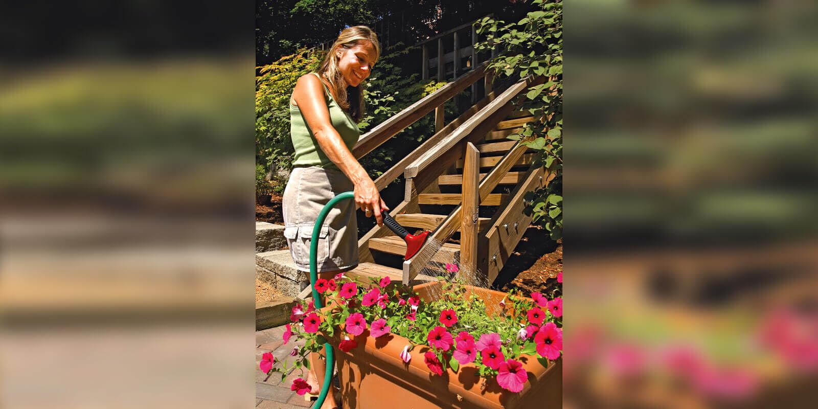 • Dramm Metal Fan Nozzle with 1/4-Turn Valve Blue This nozzle delivers a gentle shower for flowers, and is the perfect tool for container gardening