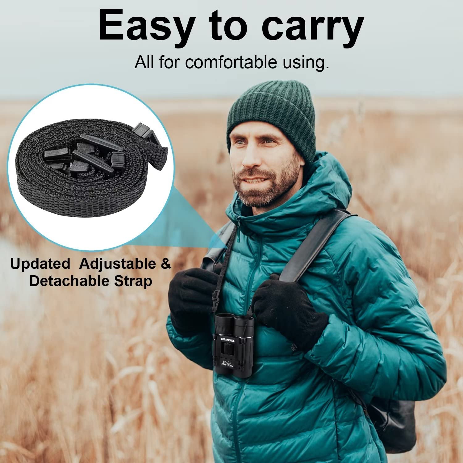 • 【12X binoculars】Equipped with 12x high power magnification, 25mm objective lens and 138yds/1094yds wide field of view. The best structure to help you look farther, see wider, get the sharp vision but without color-changed or blurred.