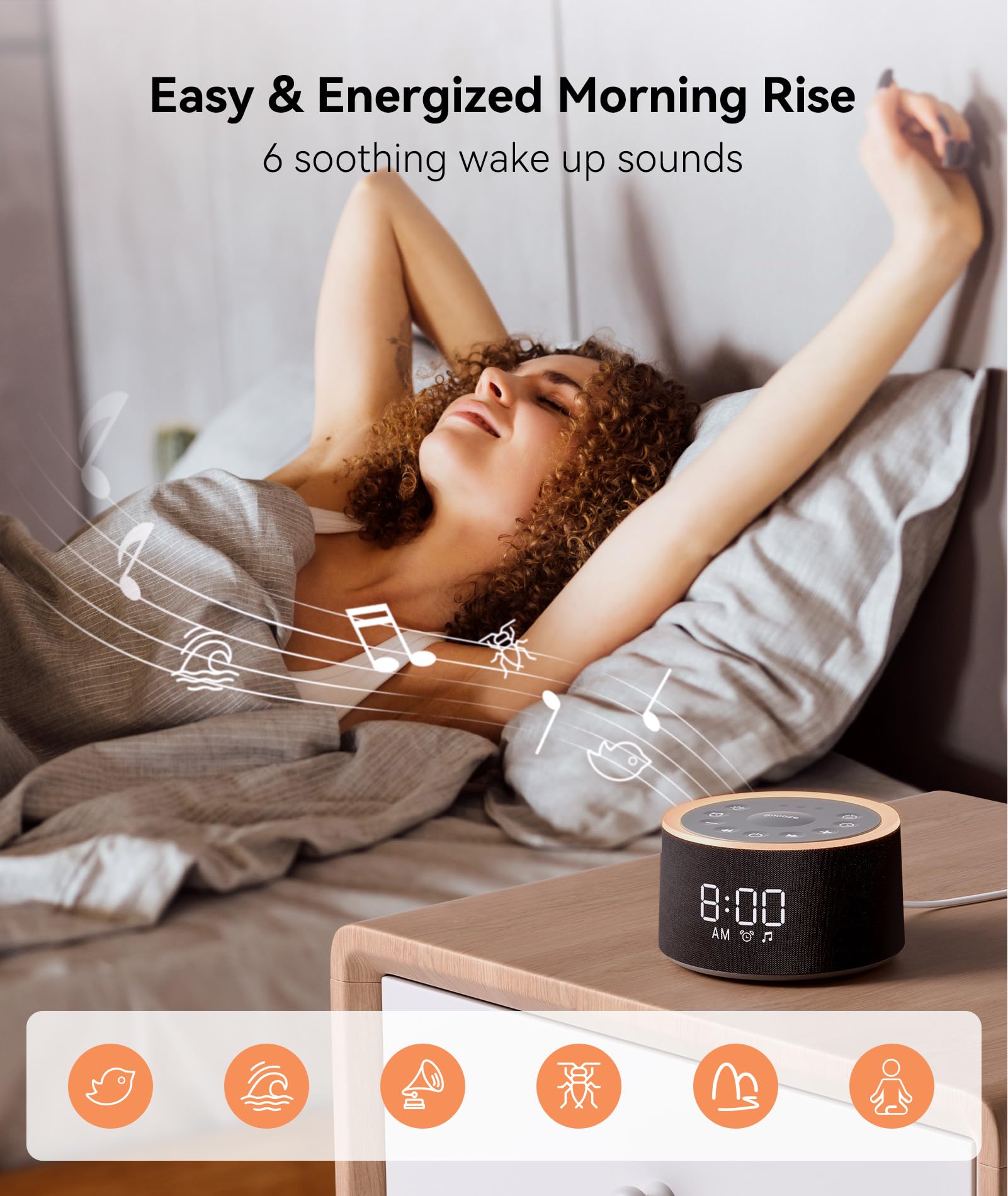 • 【GENTLE WAKE-UP】: The sound machine with alarm clock features 6 soothing nature alarm sounds and a 9-minute snooze function for a gradual wake-up. Enjoy a peaceful night's sleep and a gentle morning wake-up, leaving anxiety and fatigue behind for a fresh start to your day.