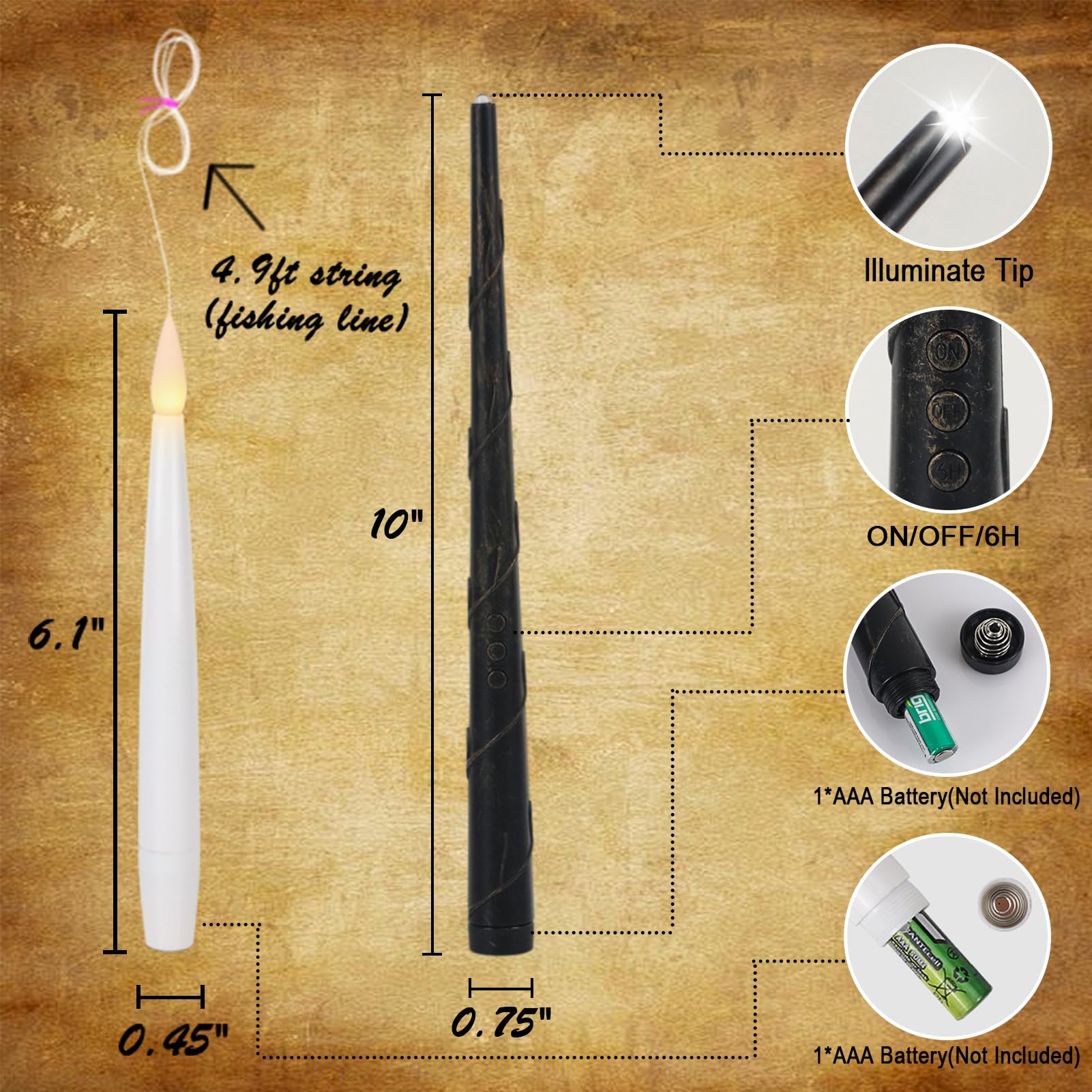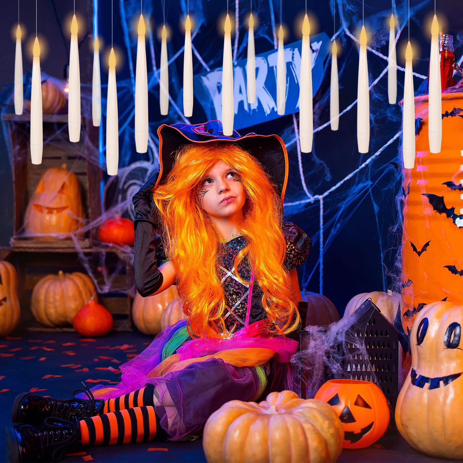 • Hanging Flameless Candle Package: You will receive 22 white floating candles with 4.9 feet 22 fishing line(fastened on candle top), 24 hooks, 1 magic wand remote. Amber yellow lights flickering create a mystical atmosphere with your Halloween decoration