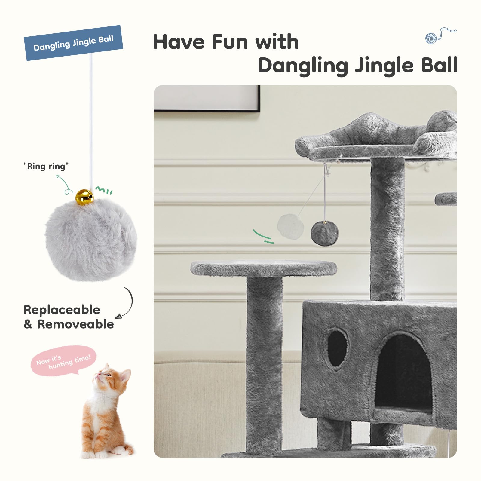 DUMOS 54-inch Indoor Cat Tree Tower –Multi-Level Pet House for Large Cats with 2 Condos, Scratching Posts, Round Platform, Small Ladder, and Toys, Light Grey