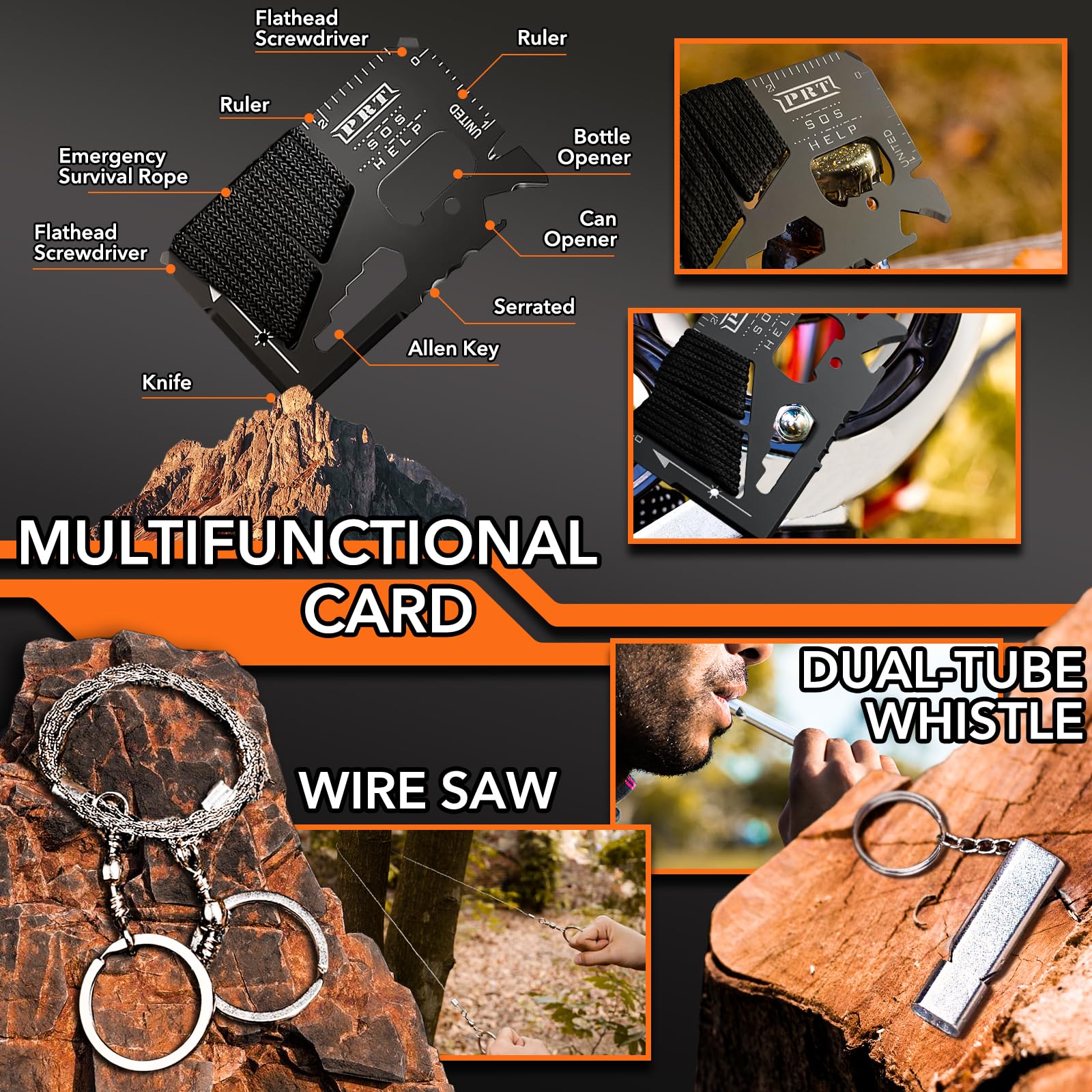 • Emergency Survival Kit: The survival kit contains an exquisite gift box, waterproof box, survival bracelet, flashlight, multifunctional spoon and card, wire saw, whistle, fire starter & ruler, fire starter rope, water bottle clip, carabiner, emergency blanket, tactical pen, keychain screwdriver, fishing equipment kit, compass, parachute cord