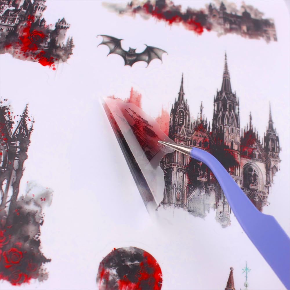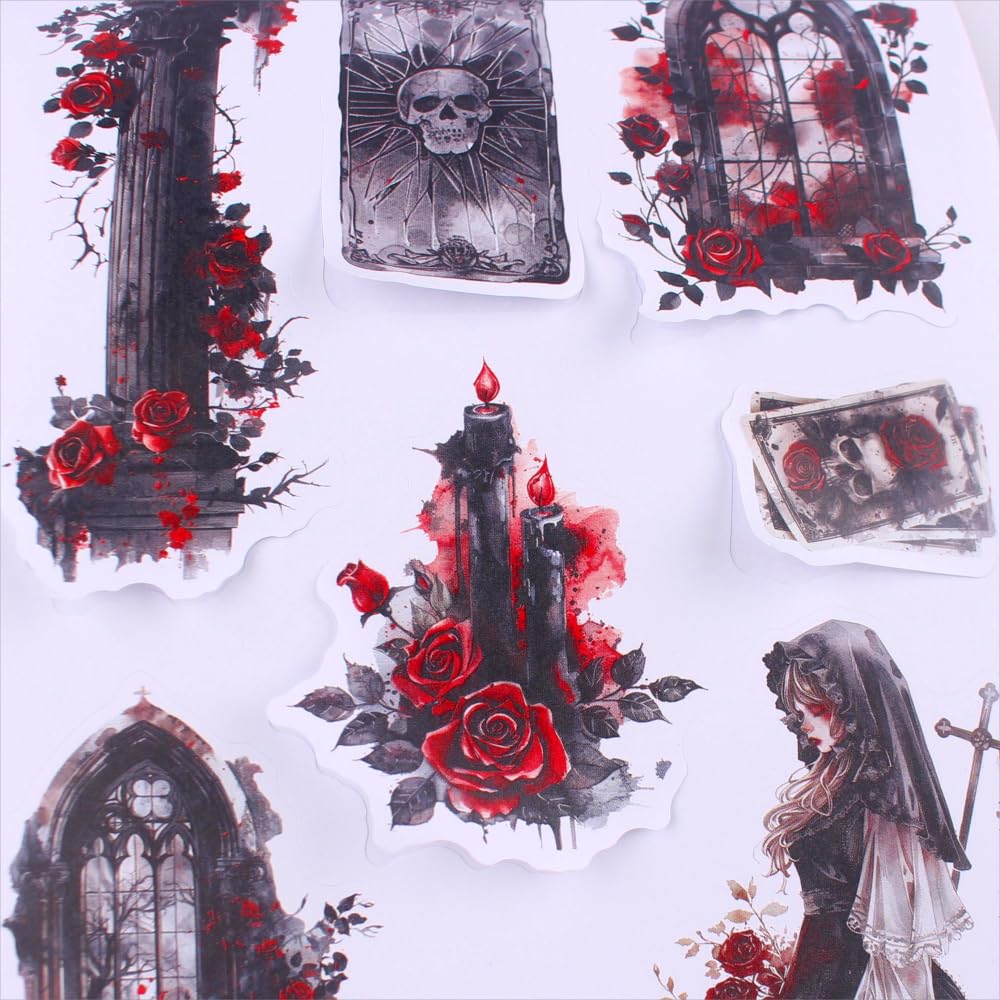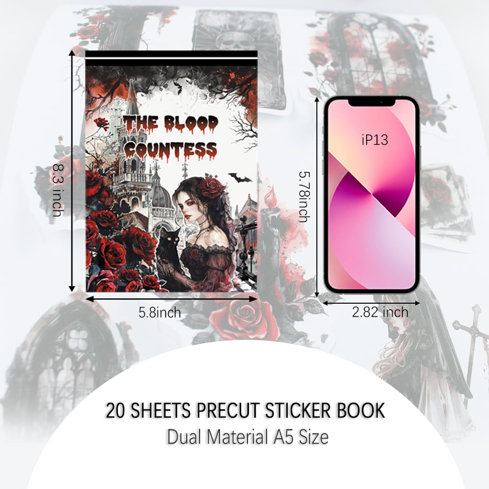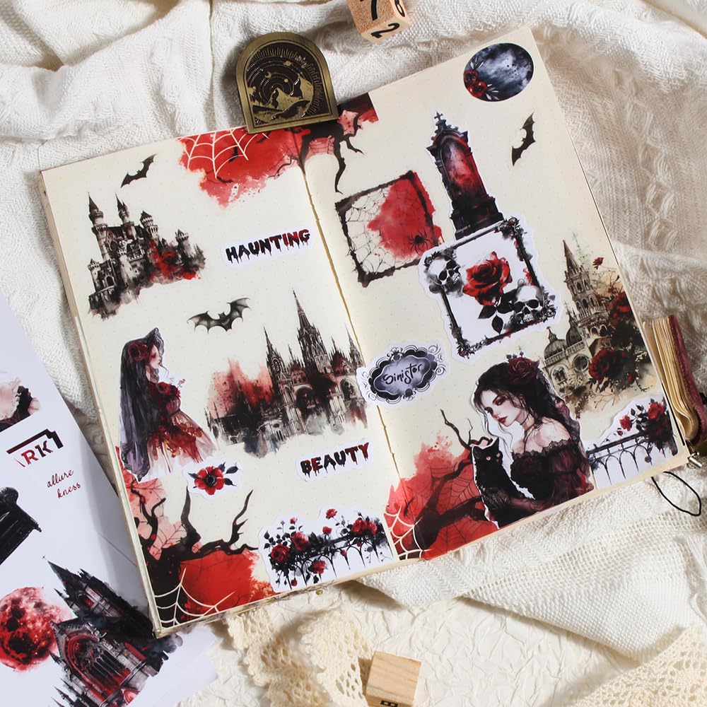 • HALLOWEEN THEMED DESIGNS: Featuring over 200 unique Halloween-themed designs, our sticker book includes a variety of elements such as lady and man characters, roses, graves, crows, spiders, bloodstains, castles, bats, and more. These stickers are perfect for adding a spooky, vintage touch to your projects. The black and red color scheme enhances the eerie aesthetic, making them ideal for Halloween decorations, junk journals, and themed scrapbooking