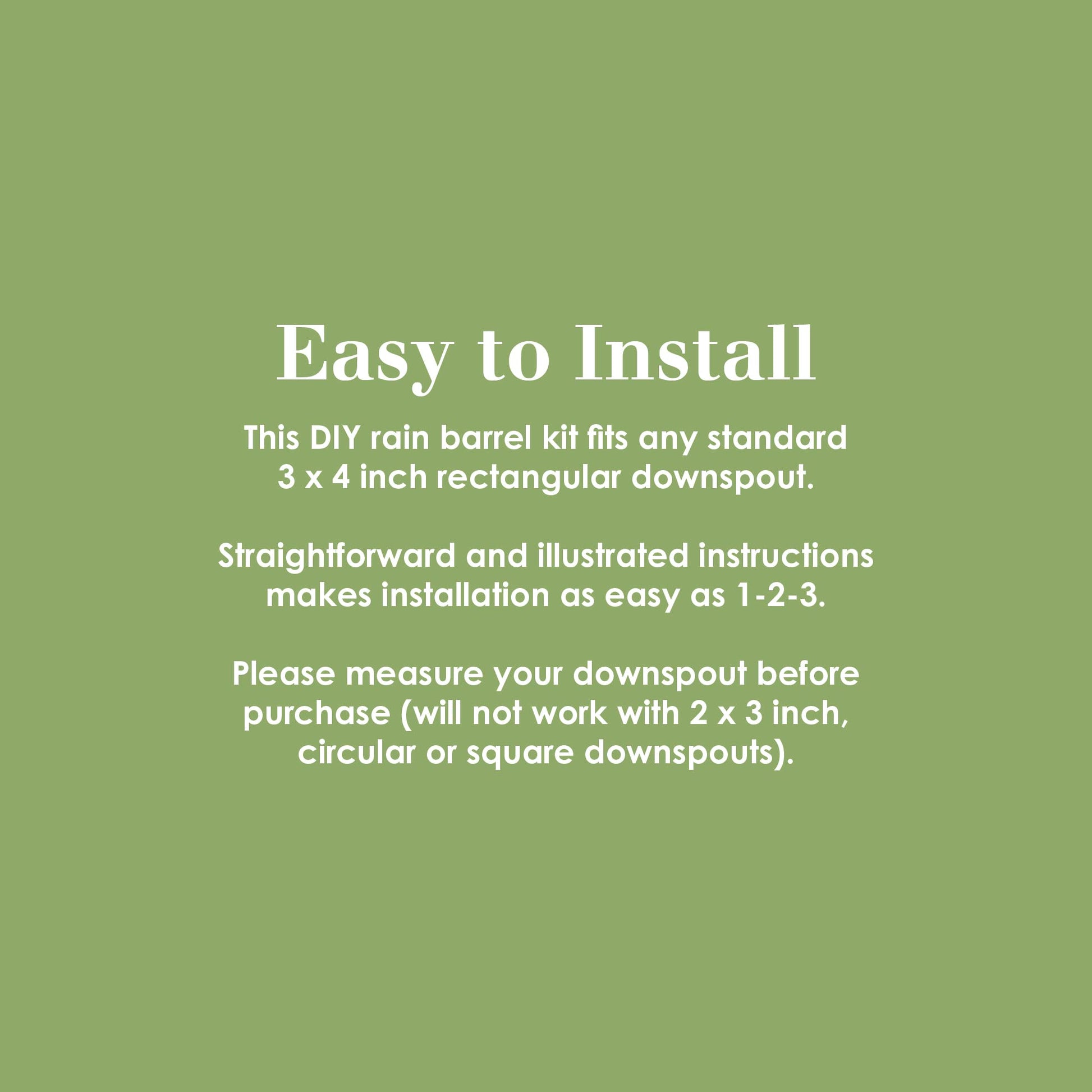Details: EarthMinded DIY Rain Barrel Diverter and Parts Kit (for 3 x 4 inch regular downspouts) is a state-of-the-art water collection system that allows you to convert any barrel or container into a rain barrel in minutes. A rain barrel can be located at any downspout around the home, garage or out-building to catch and store rainwater that can be used to water flowers, plants, lawns and landscaping, as well as for other outdoor chores. Rain barrels are an effective and environmentally friendly approach to water conservation and allow you to save water while reducing your water bill. Rain water does not contain additives commonly found in tap water, making for healthier plants and soil. The patented FlexiFit diverter installs easily by drilling a single hole into any standard 3” x 4” rectangular downspout. The diverter sends rainwater directly into the barrel. Once the barrel is full, the diverter will automatically pass excess water through the downspout. The kit includes a spigot designed for filling watering cans and a connection for a soaker hose. The following tools are required to install the kit: drill, level, measuring tape, screw driver, pencil or marker, scissors, safety glasses, safety gloves. This diverter offers advantages over conventional top fill rain barrels that commonly overfill and flood with heavy rain, requiring permanent modifications to your downspout. TheFlexiFit diverter helps deter algae-causing sunlight from entering the barrel. The parts kit is designed for use with a suitable water tight container with lid or a sealed drum. It works with plastic and wooden barrels but is not designed for use with metal drums. We recommend measuring your rectangular downspout before ordering this product.