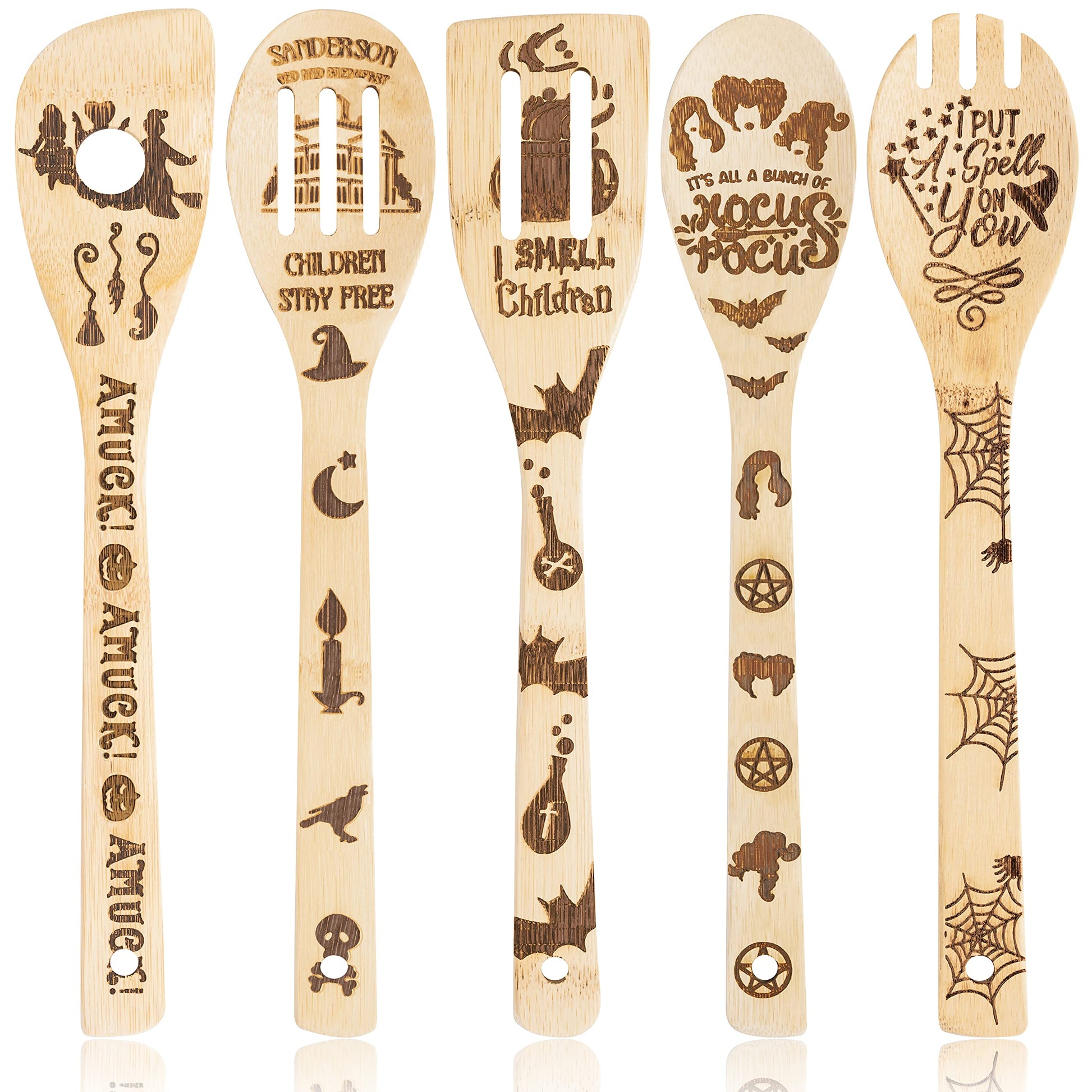 Eartim Hocus Pocus Wooden Cooking Utensil Set - 5Pcs Halloween Kitchen Cooking Gadget Natural Carve Bamboo Spoon Slotted Spatula Non-Stick Cookware Utensil Birthday Housewarming Gift Halloween Supply