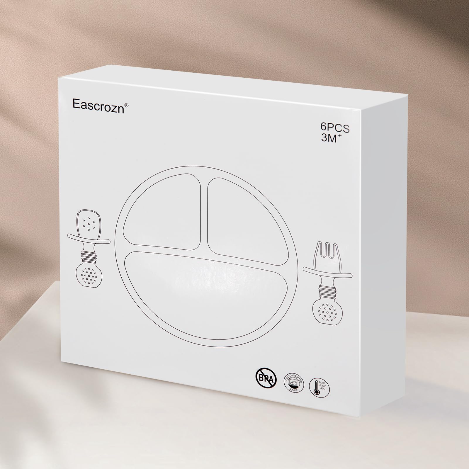 Eascrozn Silicone Feeding Set, 2 Pack Divided Toddler Plates with Suction, 2 Pack Utensils - Spoons & Forks, BPA Free, Baby Led Weaning Supplies