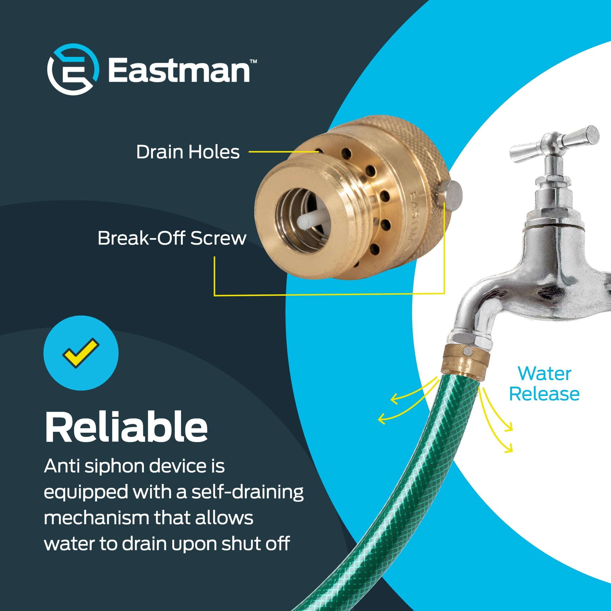Eastman's Hose Bibb Anti-Siphon Vacuum Breaker is designed for outdoor hose use. The vacuum breaker is designed to prevent the backflow of fluids back into the potable water system. This vacuum breaker is self draining and includes a break-off screw for permanent installation.