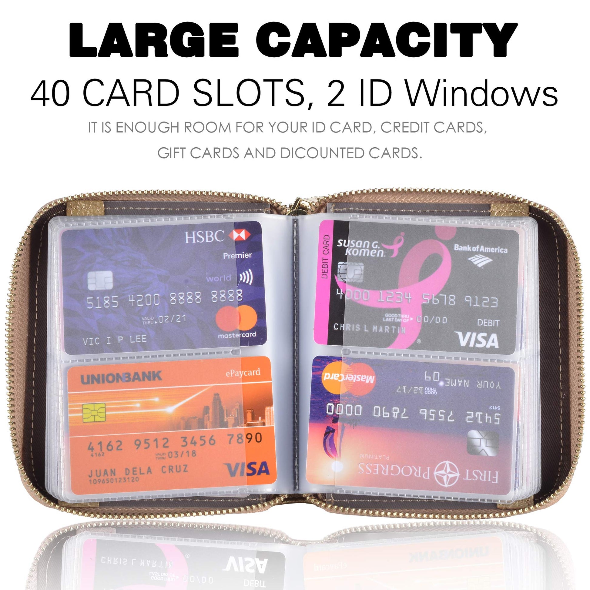 • Large Capacity: The card holder has 40 cards slots and 2 ID Windows. It is enough room for your ID card, credit cards, gift cards and dicounted cards. Small size is perfect to fit in your pockets or handbags.