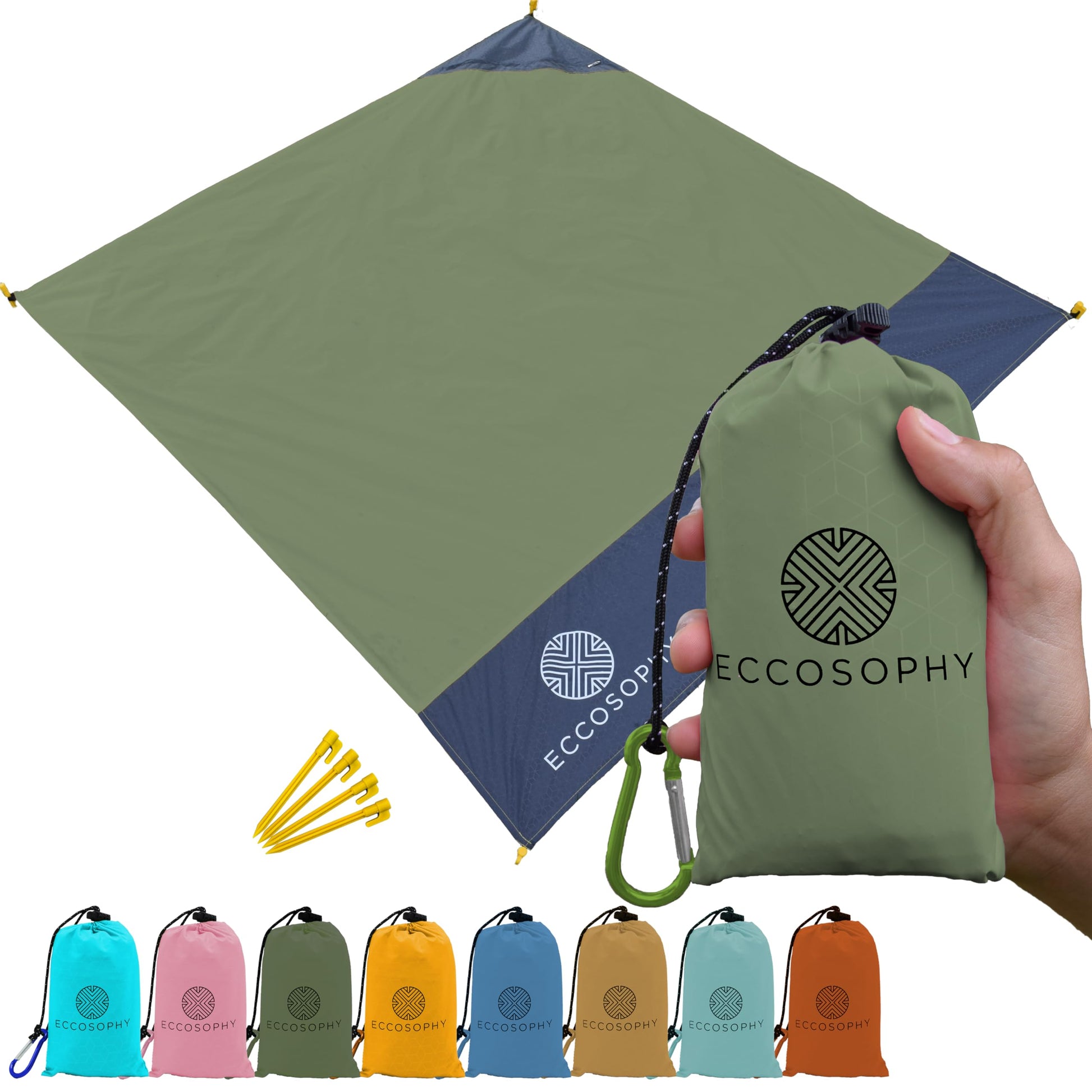 ECCOSOPHY Sand Proof Beach Blanket - Waterproof Picnic Blanket 60x55-Outdoor Compact Pocket Blanket-Lightweight Ground Cover for Hiking, Camping, Festivals, Sports, Travel-with Bag & Stakes (Olive)
