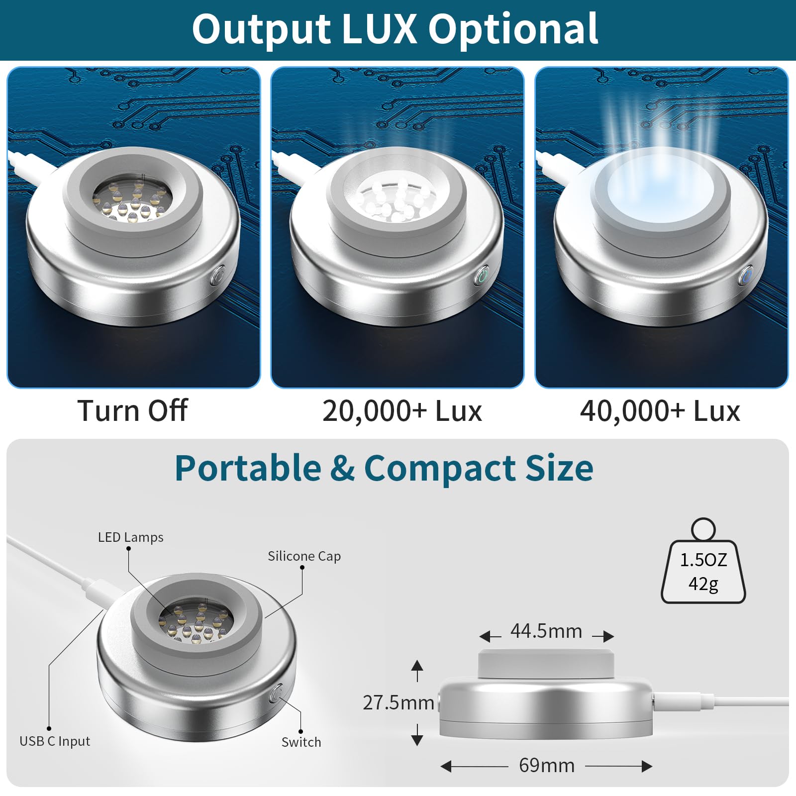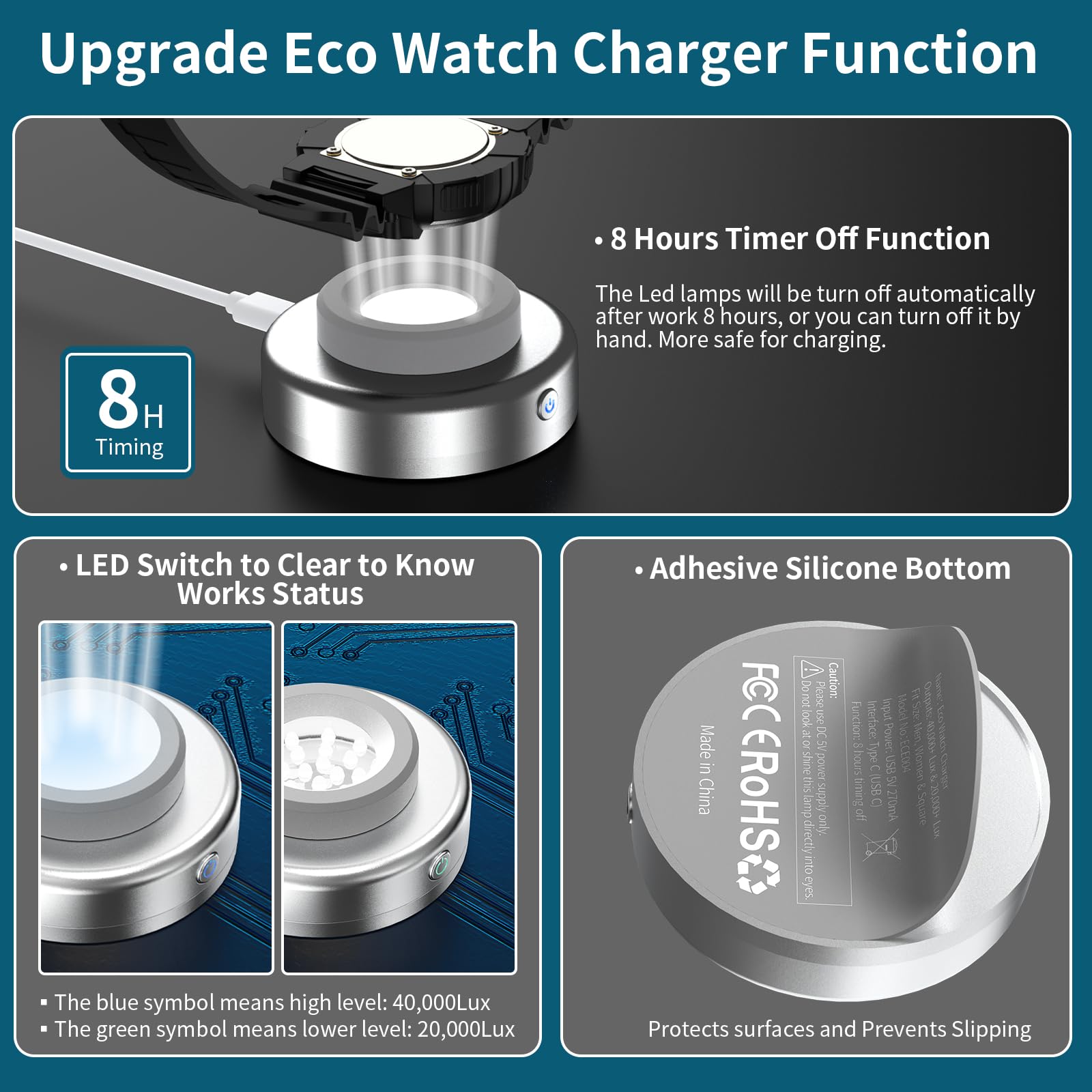 • 【Led Lights Watch Charger】 The white led lights watch charger can works for your ECO watch at anytime, everywhere and whenever, 24 hour x 365 days available. The UV Light charger have 2 levels of brightness light power output, 20,000+ Lux and 40,000+ Lux optional, Keep stay on best status and well distributed lights as sunlight to charge the eco watches.