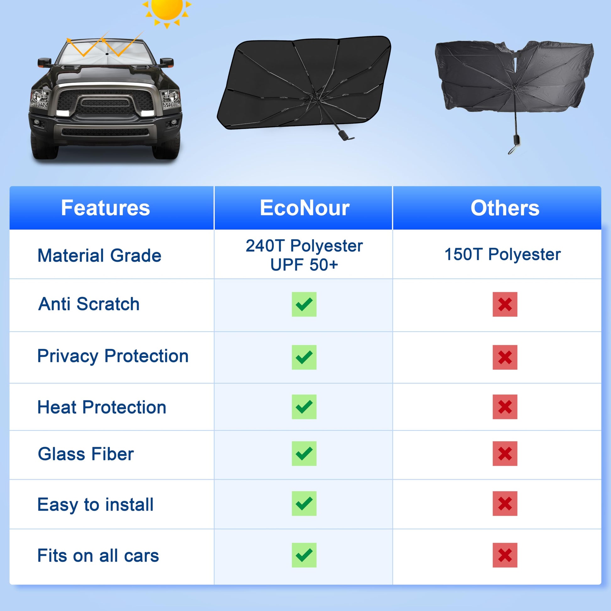 • Universal Fit for Most Vehicles: EcoNour umbrella car shade offers a universal fit 57' x 30', making it compatible with most cars, SUVs, trucks, and even RVs. Whether you drive a sedan, a BMW, a Mercedes Benz, or any other vehicle, this windshield umbrella sun shade will keep your vehicle cool and protected.