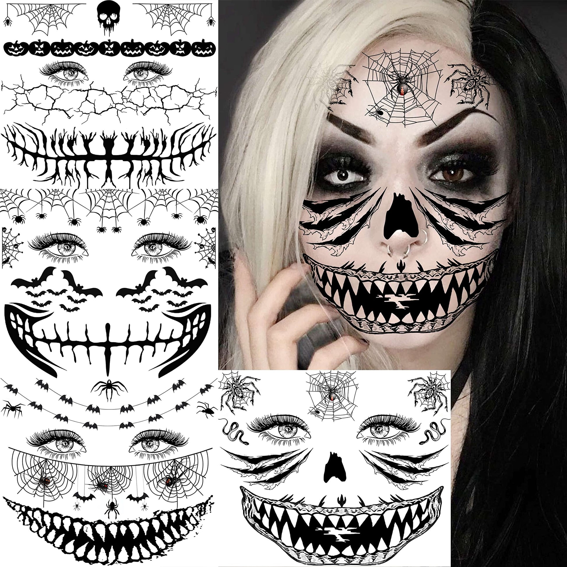 EGMBGM 4 Sheets Scary Halloween Face Temporary Tattoos For Women Men, 3D Witch Zombie Makeup Kit For Kids Girls Boys Adults, Dia de los muertos Day of the Dead Makeup Face Tattoos Spider Web Bat Scar