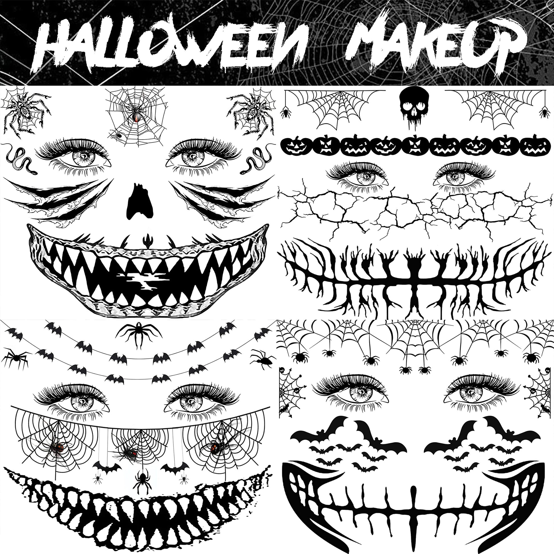 🍷4 Sheets Realistic Halloween Face Temporary Tattoos Sticker Fashion Designs🍸 EGMBGM Brand Original Zombie Makeup Kit For kids Adults Vampire Halloween Temporary Tattoos For Adults. There Are 4 Sheets Chucky Makeup Face Fake Stitches Scratches sugar skull bat witch Spiderweb Spider Web Horror Scar Scab Scary Blood Cut Wound Temporary Tattoos For Kids In Each Package Of Cute Size 16x13.5CM 6.2'x5.3' Spider Temporary Tattoos For Women Men Daughters Son Children Bulk.