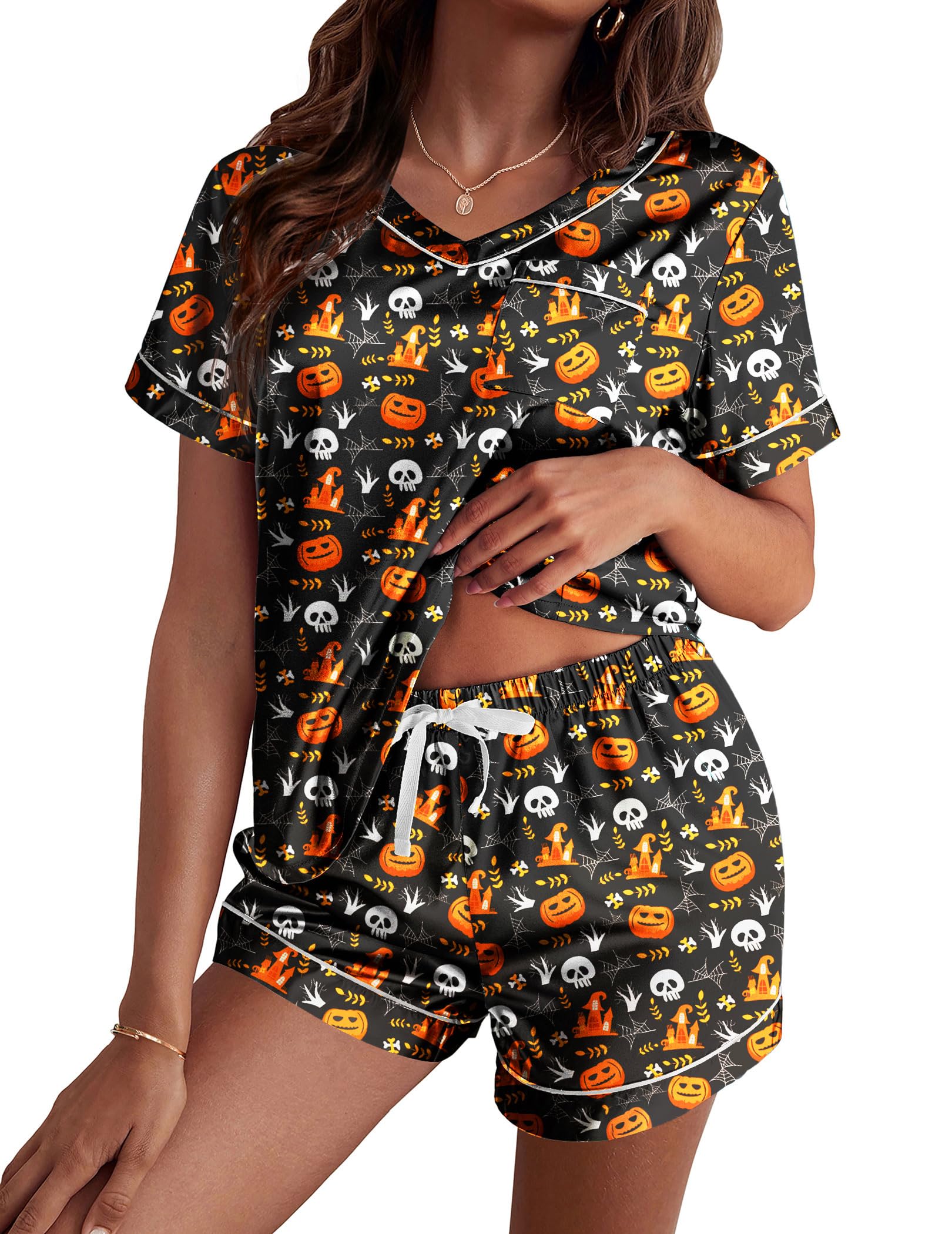 Ekouaer Silk Pajama for Women Short Sleeve Satin Pj Set Two Piece Soft Sleepwear Loungewear, Black Pumpkin & Spider Web, M