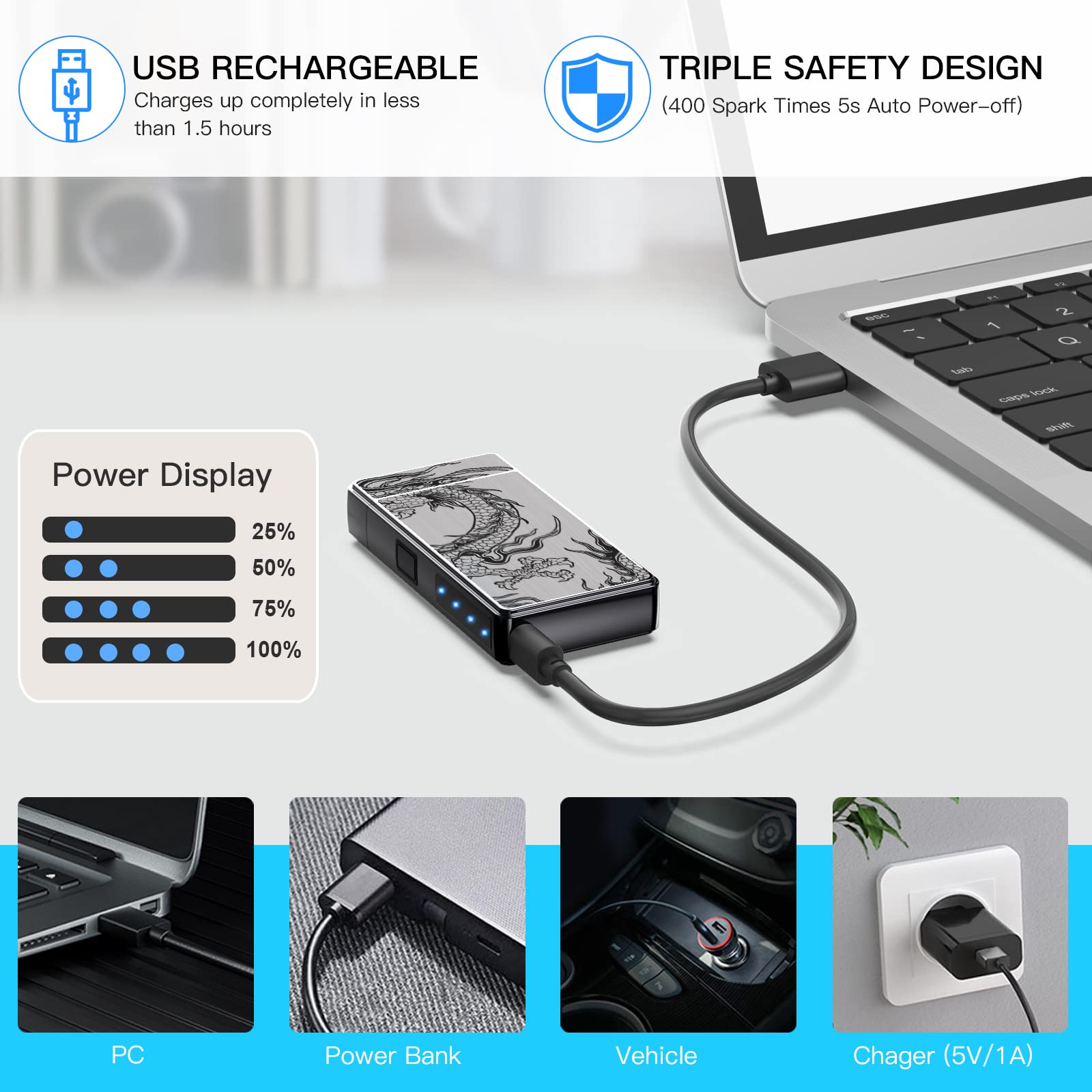 Before your first use, to ensure sufficient power please charge it for 1--2 hours. Charging it via USB Cable by using your USB Charger, PC or Power Bank, anyway, it is universal in charging. Please be informed that the lighter’s charging port id half-soft design which means that you just have it half plugged--in with the usb cable. Don’t force it hardly.