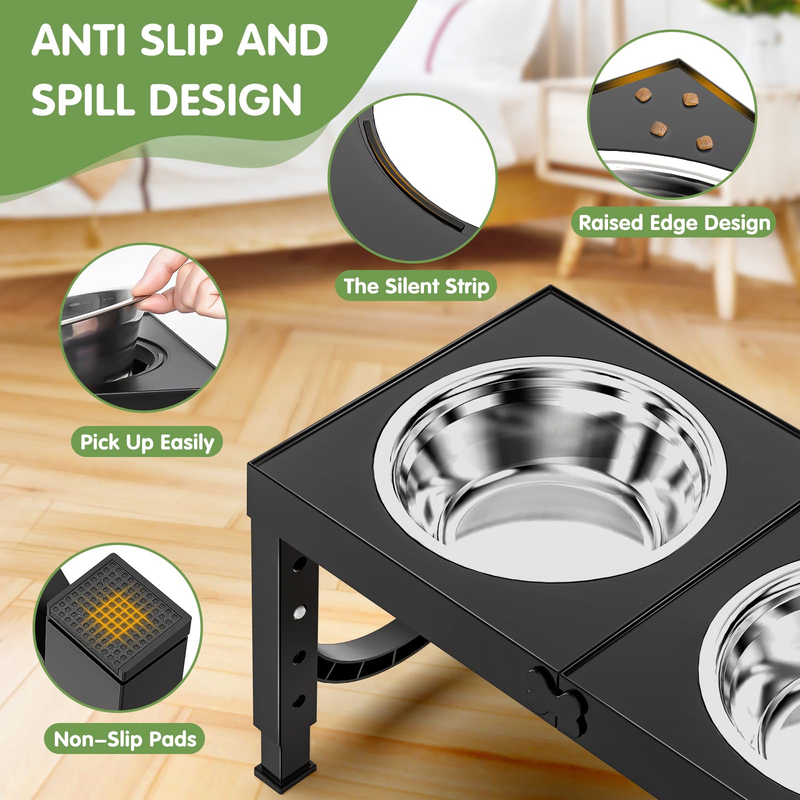 • FOUR ADJUSTABLE HEIGHT RAISED DOG BOWLS: Our raised dog bowls for large sized dog can be adjusted to four different heights 3.15'' 9.09'' 10.63'' 12.20'' 13.78'', suit for all breeds and ages. Designed for large dogs, the maximum adjustable height is approximately 1.58 inch higher to fit large dogs needs.