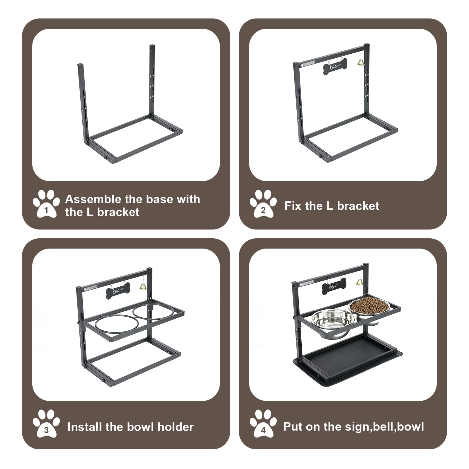 • PET INTERACTION: Special bells can be used to call your pet to eat. This dog bowl holder kit comes with a free white pen that you can use to write on the sign. Spilled water and food will land nicely on the mat