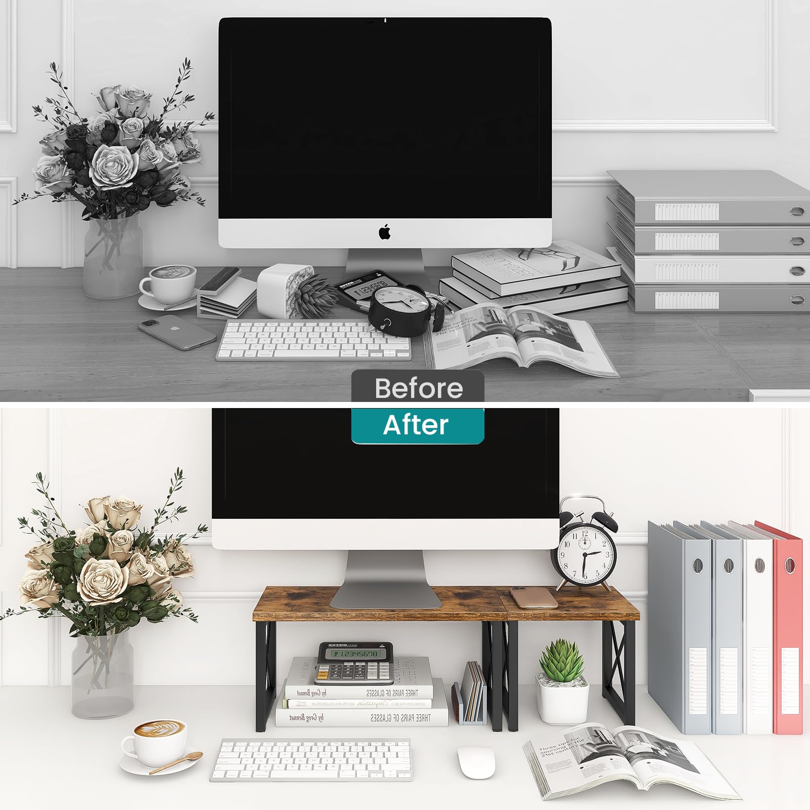 • 【Multifunctional Use】The desk organizer shelf can put some books, documents, office supplies, decorations, spice vases, plants, etc., which can not only make the space tidy but also make the goods more orderly storage. The wood display shelf can be used as a computer monitor stands and printer stands to help you maximize your workspace by providing additional storage options without taking up too much space.