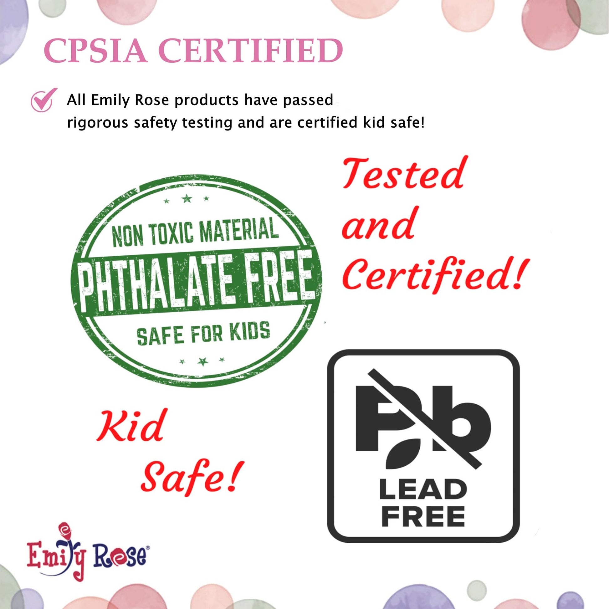 • KID SAFE: All Emily Rose products have passed required CPSIA and ASTM child safety testing, and are fully certified. Parents can have peace of mind knowing all our products are phthalate and lead free.