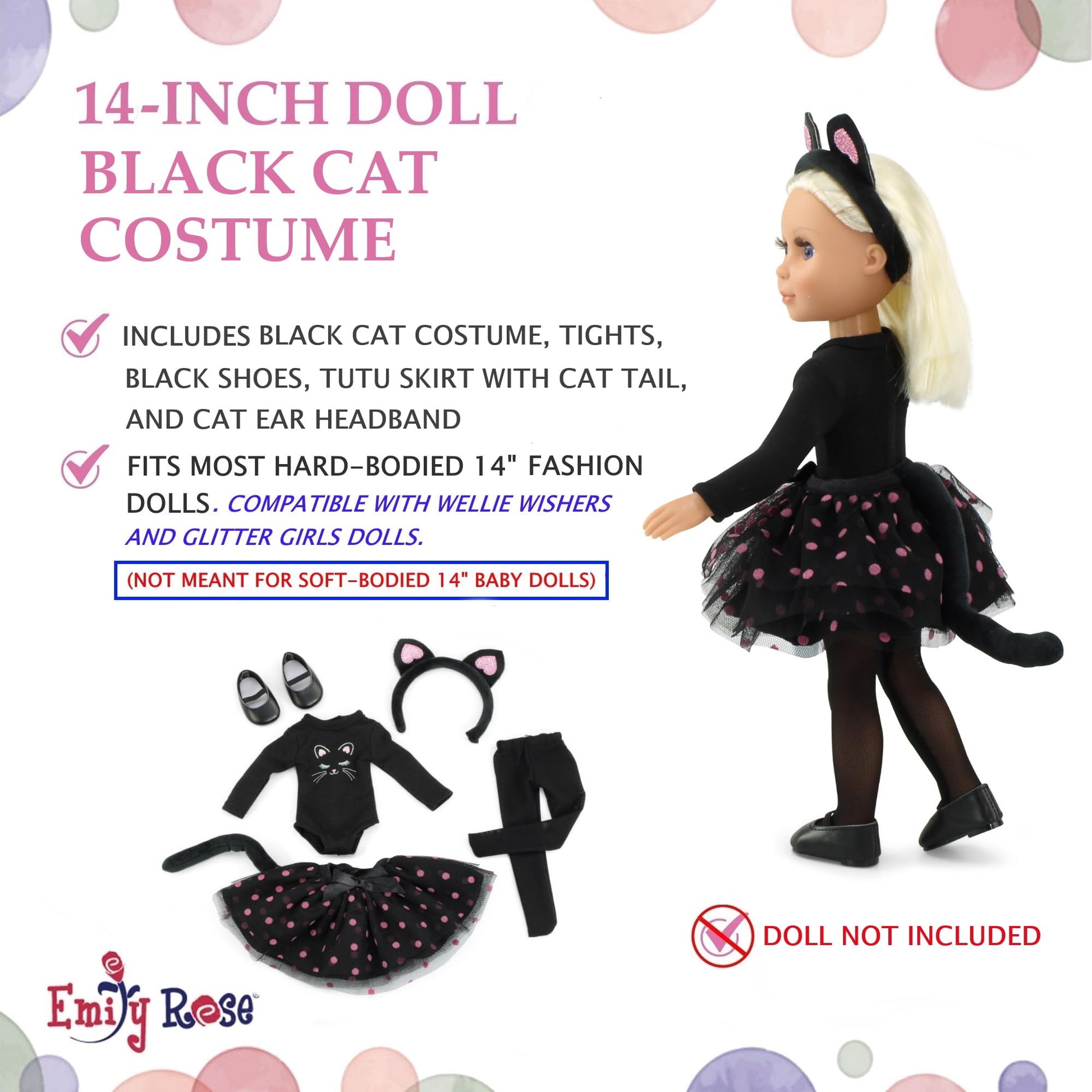 • FEATURE DESCRIPTION: Amazing 14-in doll costume outfit, includes glittery black cat leotard and muti-layer full tutu skirt and is complete with tights and shoes!