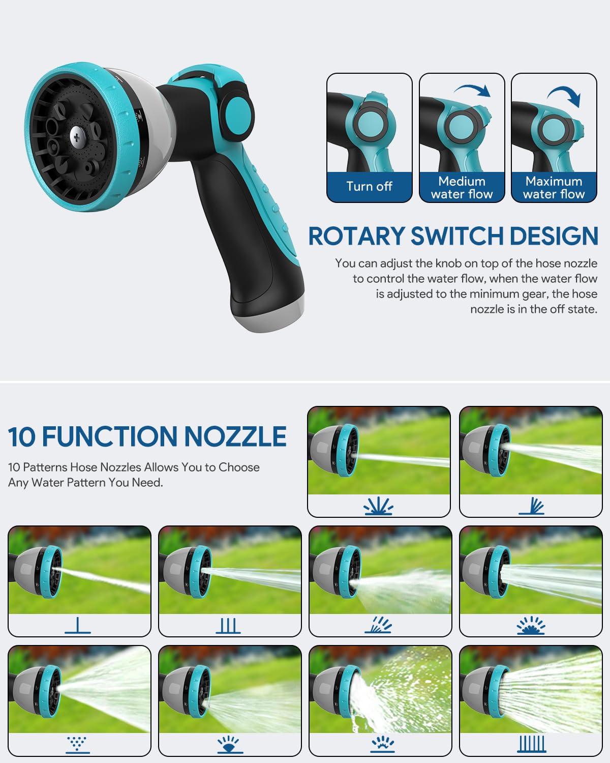 • 【10 PATTERNS WATERING HOSE NOZZLE】 - The hose with 10 patterns hose nozzle allows you to choose any water pattern you need. Whether you need to water your garden, water your flowers, rinse the ground, give your pet a bath or rinse the stains off the surface of your car, it's got you covered! With the built-in handle you can carry it with ease.