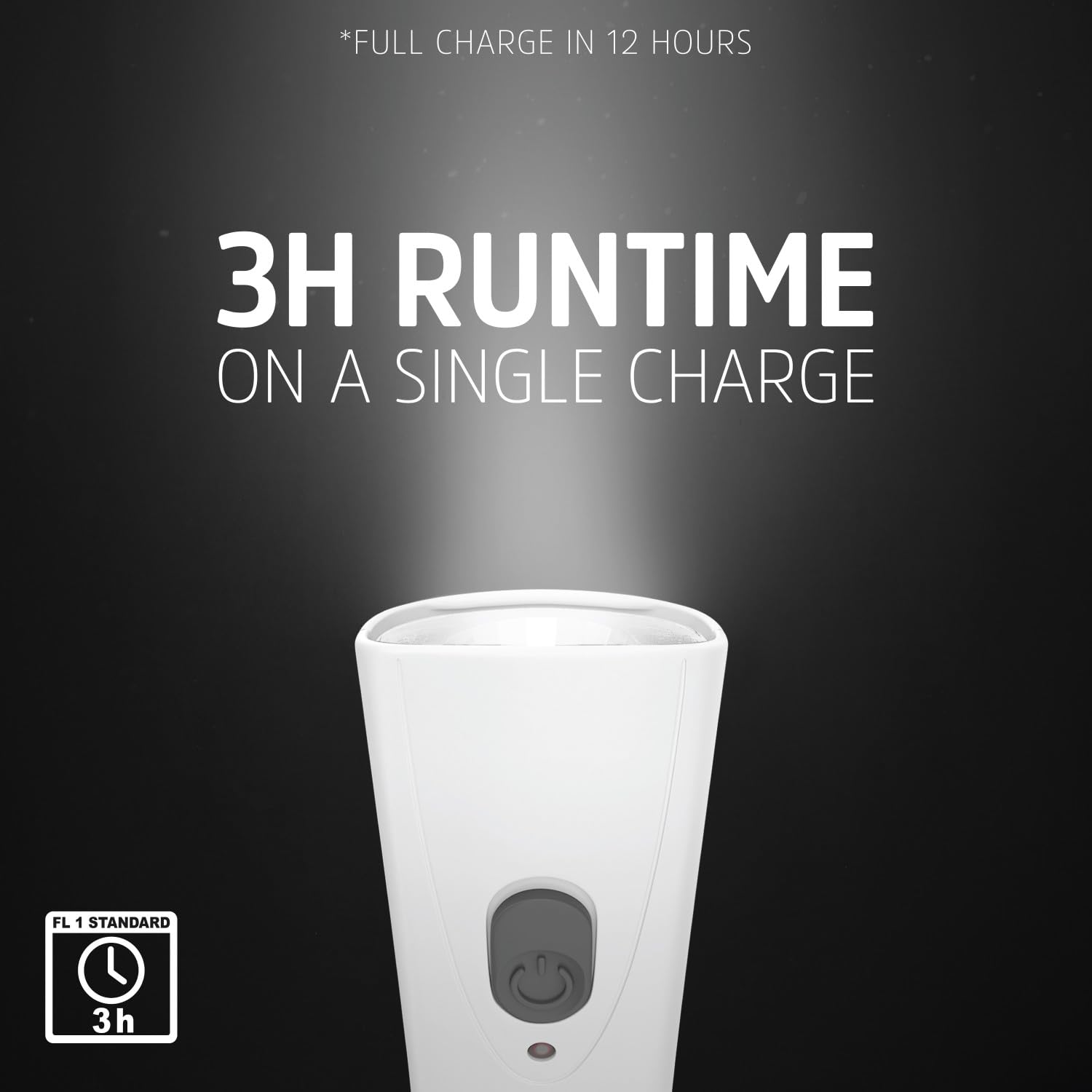 Details: Energizer Weatheready Rechargeable Compact Handheld Light helps you prepare for power outages with a rechargeable plug-in design. The LED rechargeable light features a built-in rechargeable battery and plugs into the wall so it's always charged, making it great to use as an indoor emergency light. Energizer's emergency flashlight is up to 4x brighter than standard LED technology. A retractable AC plug fits into standard outlets and folds out of the way while you use the Energizer flashlight. The pocket flashlight runs for up to 3 hours. Leave the switch in the on position while it charges so the compact flash light turns on automatically if the power goes out.