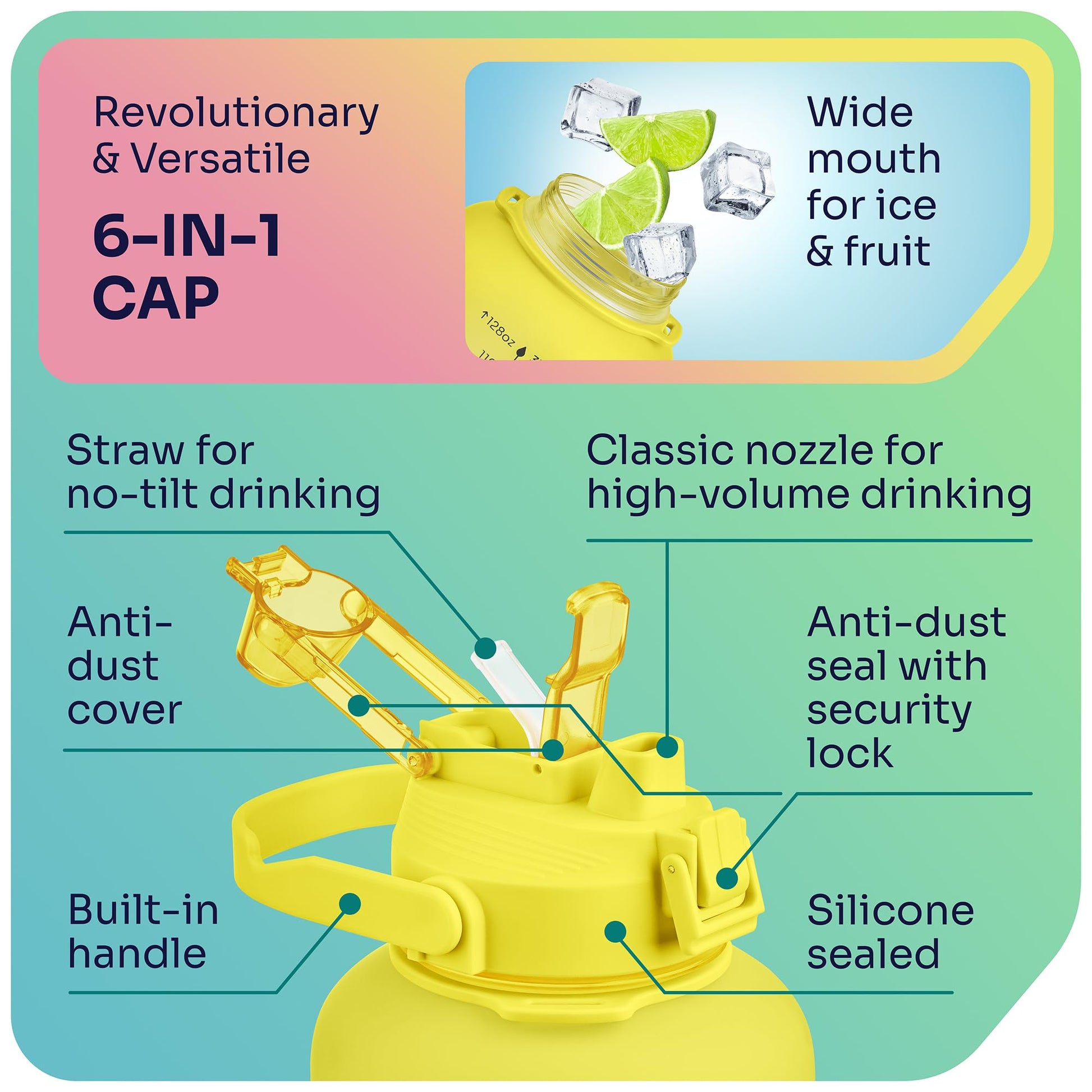 • 6-IN-1 SIP VERSATILE. Choose your drink style with the advanced 6-in-1 cap on the one gallon water jug: options from a classic nozzle to a no-tilt straw. The water bottle gallon jug has a security lock and built-in handle for easy on-the-go hydration