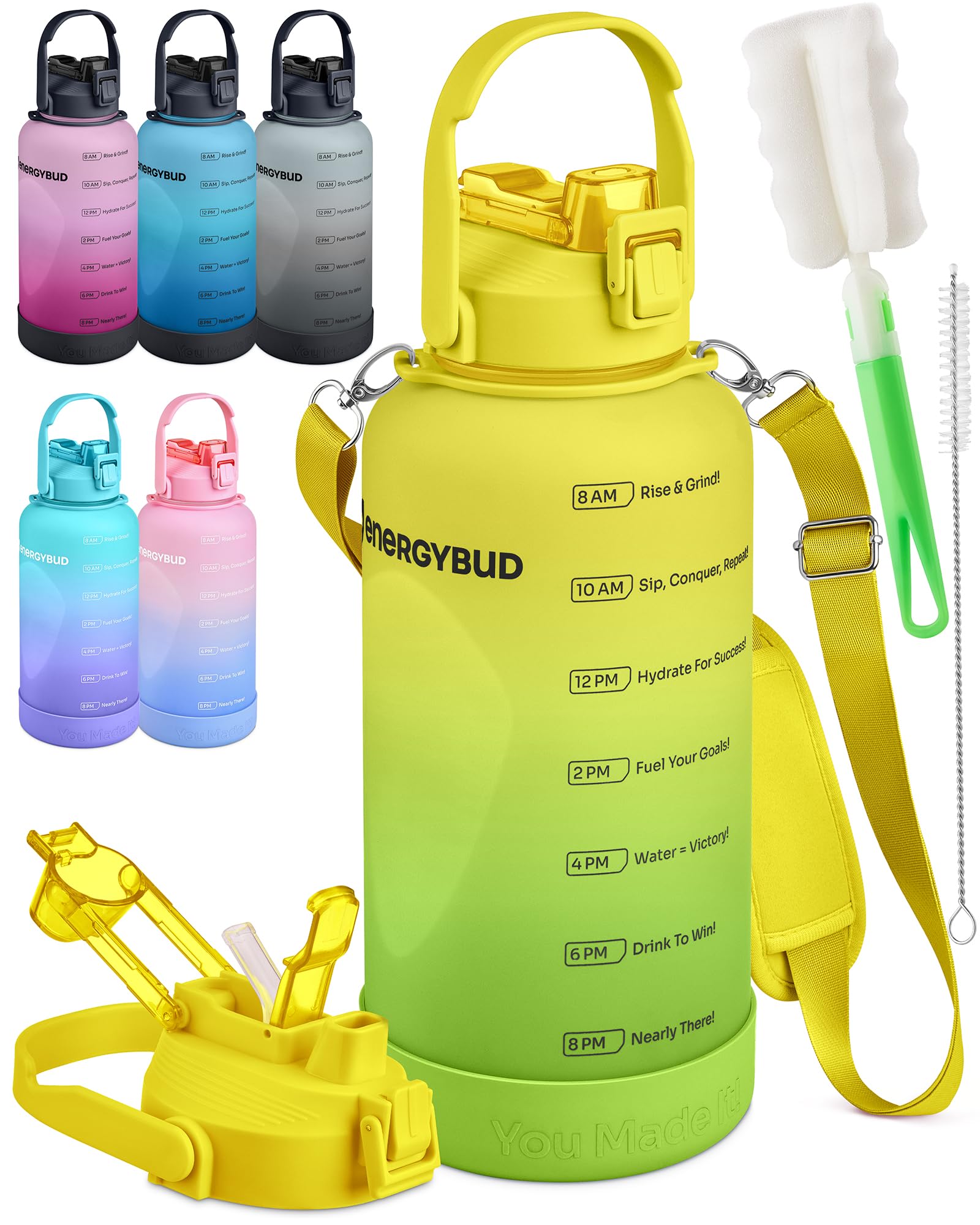 EnergyBud 1 Gallon Water Bottle Removable Straw And Handle Dishwasher-Safe BPS & BPA & DEHP Free +2 Brushes Big/Large Bottle With Time Markers Wide Mouth Leakproof 128 oz Jug (Yellow & Green)
