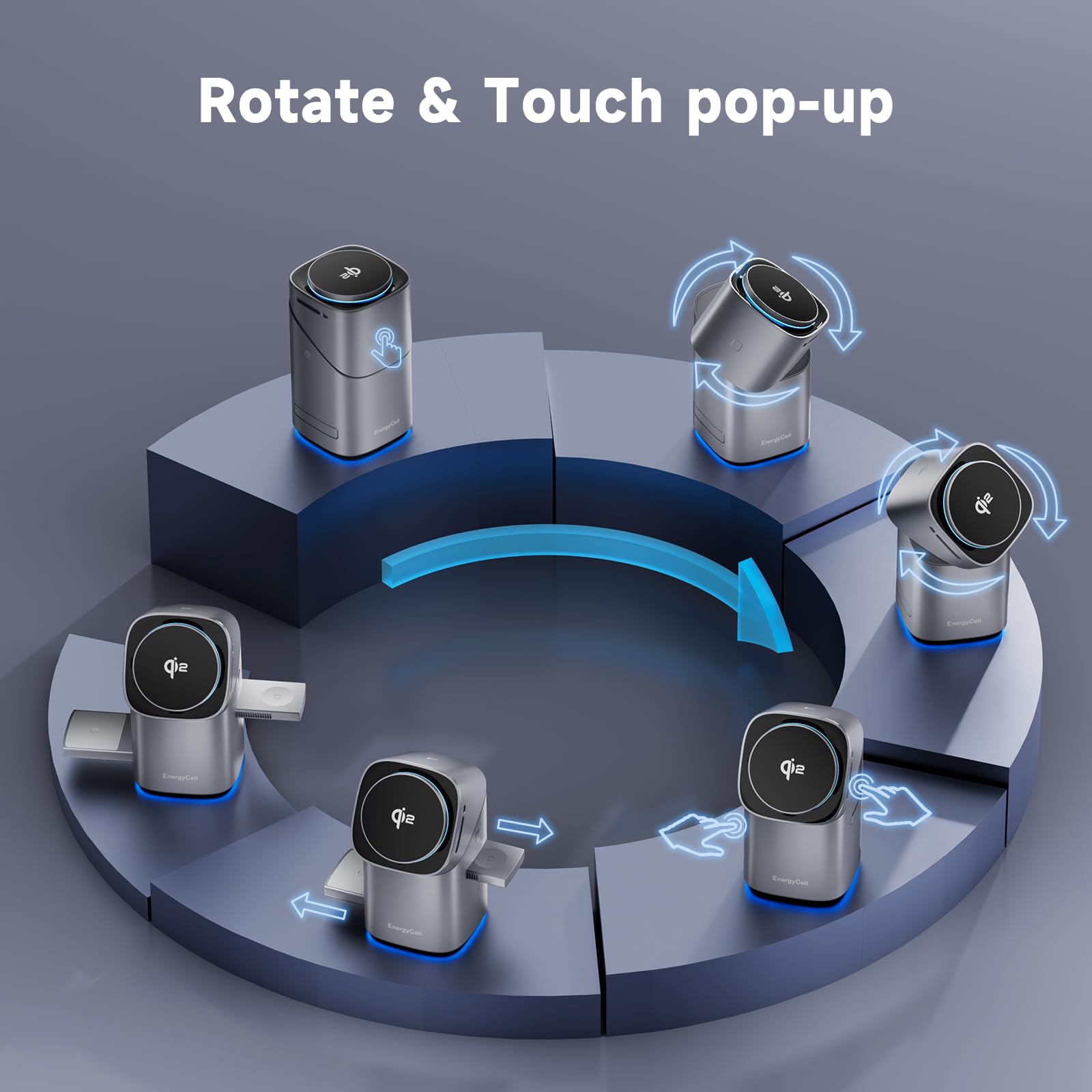 • Touch Sensitive Stand : The EnergyCell 3 in 1 Charging Station Apple for FaceTime calls, movie watching, or using iOS StandBy mode. The charging dock for your AirPods and Apple Watch pop up with a touch.Switch between portrait and landscape mode effortlessly.