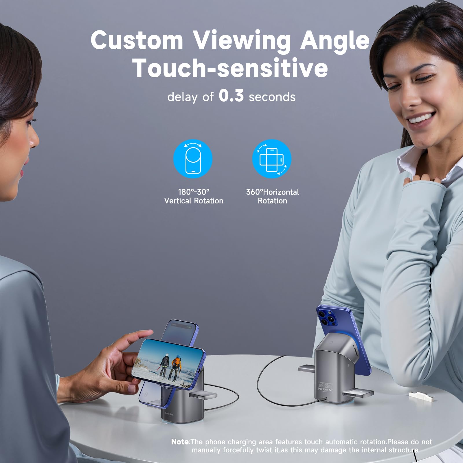 • Strong Magnetic Alignment : The Wireless Charging Station's powerful magnets keep your devices perfectly aligned. Offering secure attachment for a seamless charging experience. Compatible with Mag-Safe cases or bare phones. (Note: Thick or non-magnetic third-party cases may reduce magnetic strength and charging speed.)