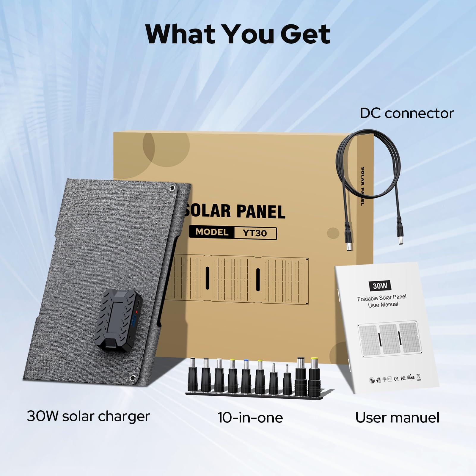 • 【What's in the Box】 1*ENOFLO 30W Portable Solar Panel, 1*10-in-one DC connector, 1*DC Cable,4*Hook,1*User Manual,12-month worry-free warranty, and our friendly customer service