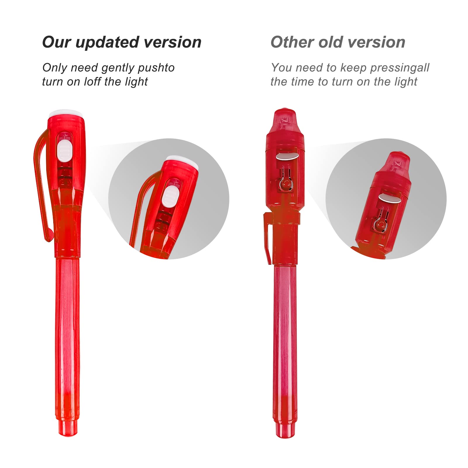 • Upgrade design: the original press type switch was upgraded to the push type switch, which can easily push and light up continuously; our upgrade invisible ink pen can emit more powerful and beautiful beams.
