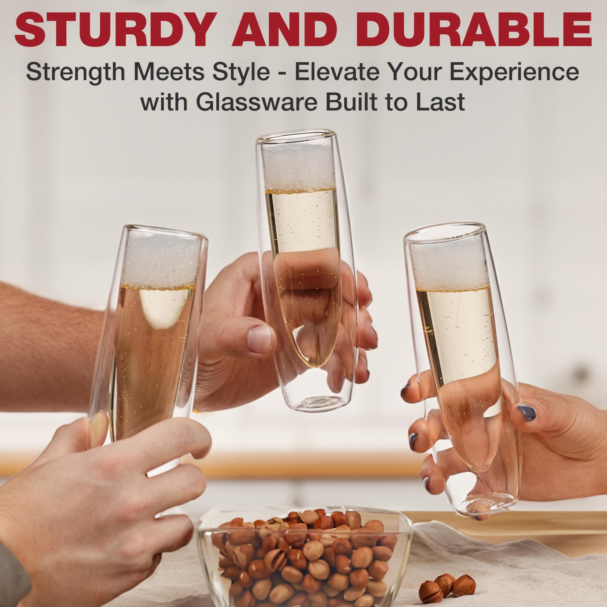 • Elegant Double Wall Insulation: These stemless double wall champagne flutes maintain drink temperature and prevent condensation. Durable and stylish, they are ideal glass champagne flutes for serving champagne, prosecco, or sparkling wine.
