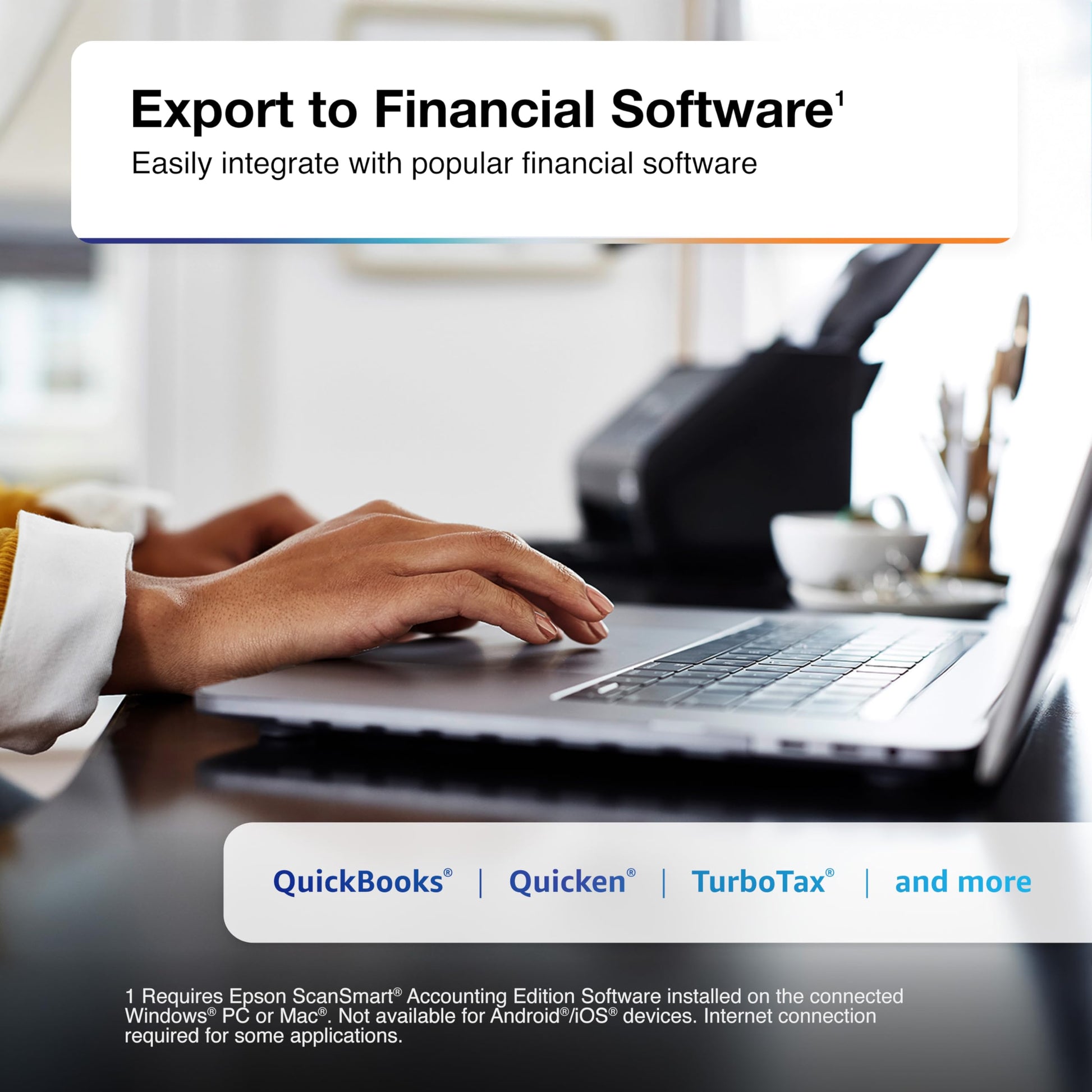 • Export to Financial Software² — Turn stacks of receipts and invoices into categorized digital data that easily integrates into financial applications, such as QuickBooks and TurboTax