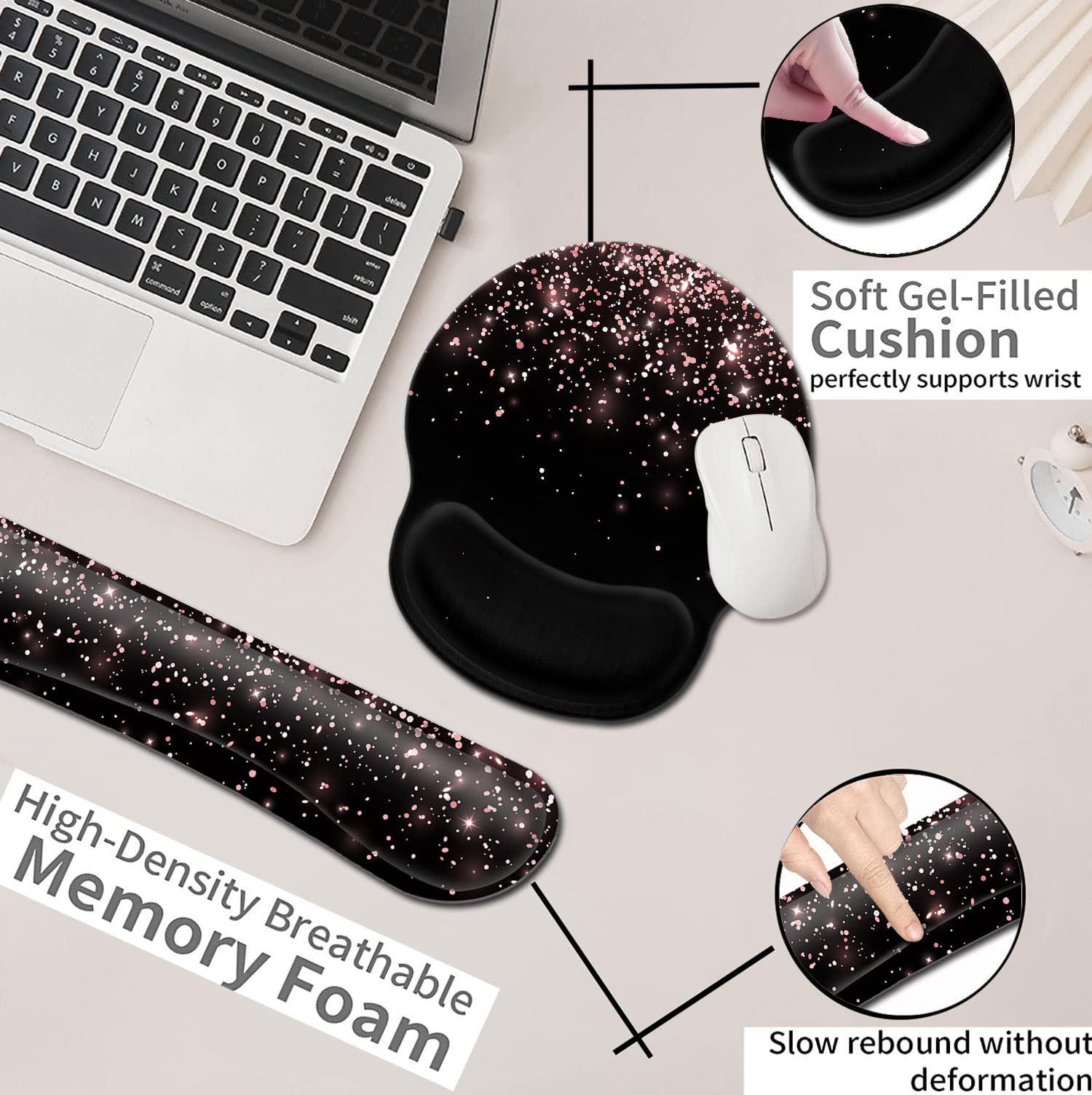 Ergonomic Gel Mouse Pad with Wrist Support - Soft Memory Foam Keyboard Rest, Dirt-Resistant, Suitable for Office Typing & Gaming, Rose Gold Glitter Pattern